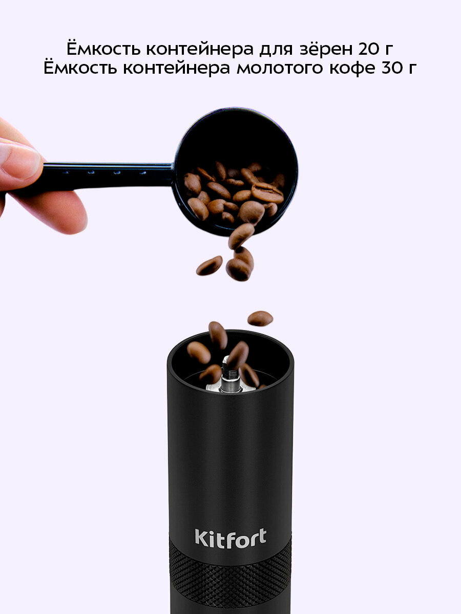 Кофемолка КТ-7605 - ваш верный помощник на каждый день. Её удобный размер и лёгкий вес делают кофемолку идеальным выбором для любителей свежемолотого кофе в любой точке мира. Ёмкость контейнера для зёрен 20 г, а для молотого кофе 30 г.