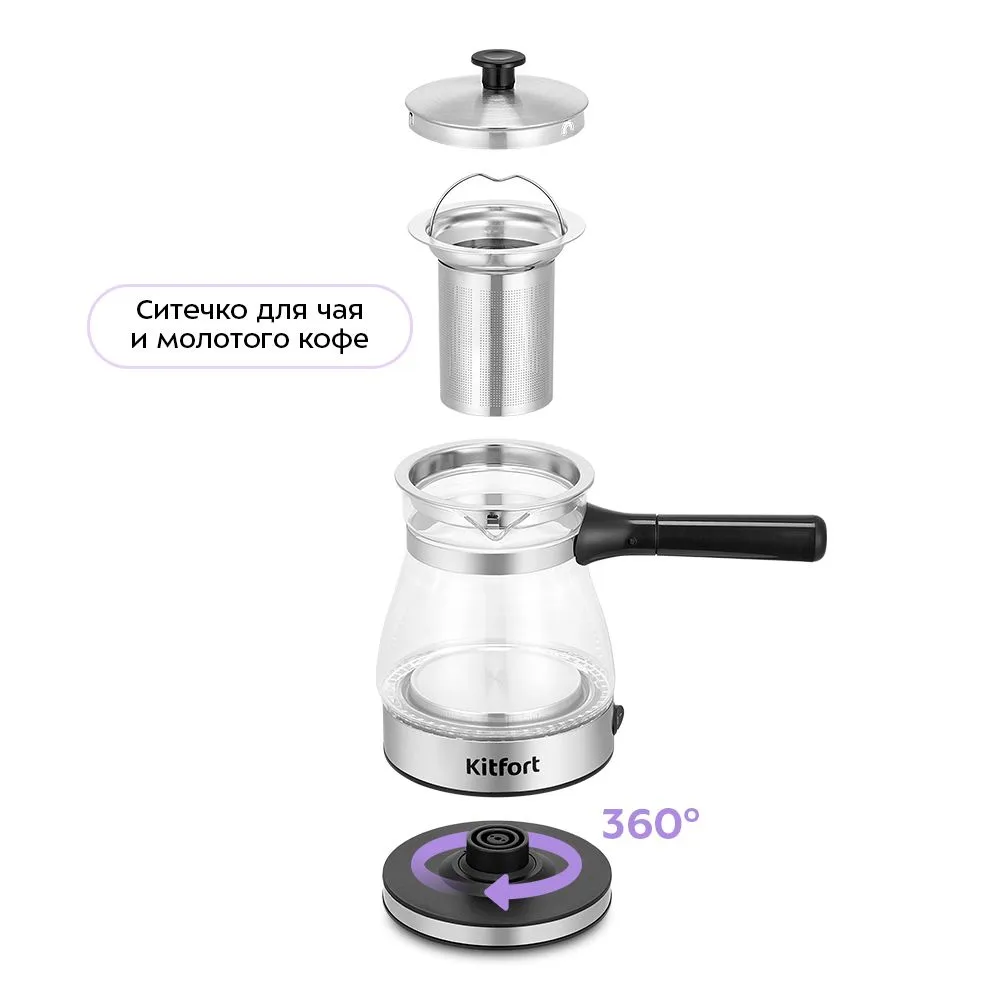 В конструкции КТ-6767 встроено ситечко, которое позволит заварить напиток и избежать попадания чаинок или молотого кофе в чашку. Конструкция турки-чайника также не ограничена в положении – ваш напиток приготовится в любом положении на платформе.