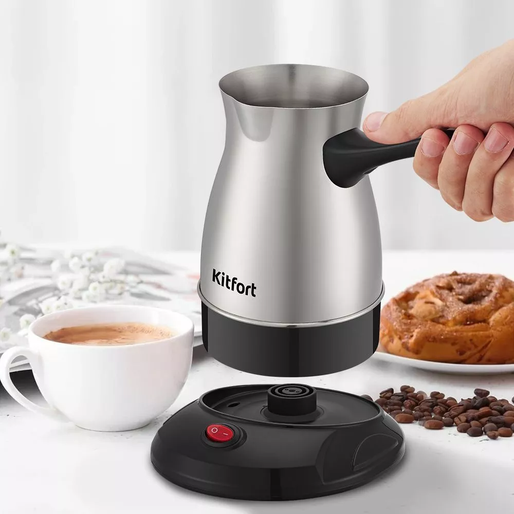 Электрическая турка КТ—7131 варит кофе по-турецки. Вы сможете быстро и легко сварить натуральный кофе на 8 чашек по 60 мл. А также подогреть молоко, приготовить какао или горячий шоколад. Ручка турки пластиковая, не нагревается и удобно лежит в руке.