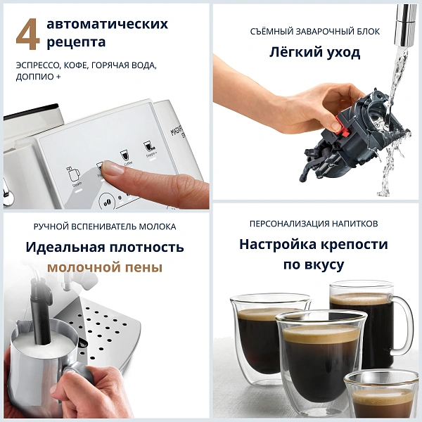 Возможность использования фильтра для воды, программирование жесткости воды, возможность использования предварительно молотого кофе