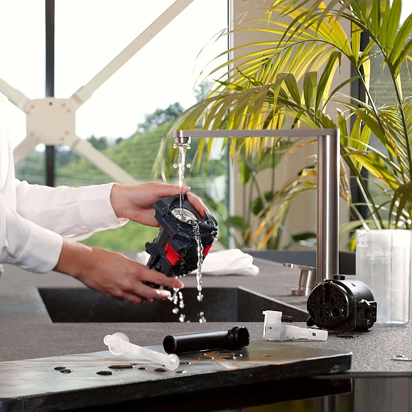 Благодаря мощности в 1450 Ватт, аппарат практически не требует времени на приведение в рабочее положение при выходе из режима ожидания. Помпа мощностью 15 бар на все 100% извлекает вкус и аромат из каждого грамма зерен, чтоб вы могли ощутить полный букет. Кофе с добавлением молока также получается высокого качества. Но чтобы так было всегда, мы рекомендуем обязательно использовать функцию очистки вспенивающей системы перед приготовлением новой порции лате или капучино. Кофемашина удалит остатки молока с ее внутренних механизмов, перед тем как готовить снова. Один поворот регулятора!