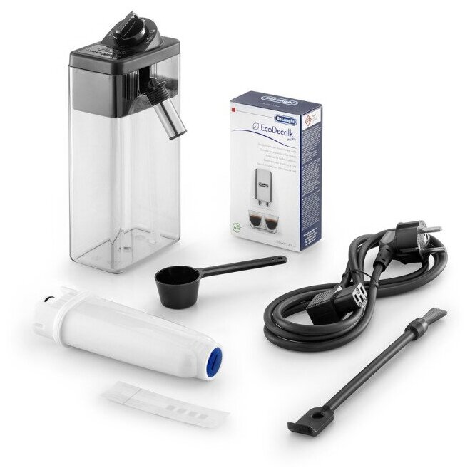 в комплекте: тест-полоска жесткости воды, мерная ложка для предварительно молотого кофе, средство для удаления накипи, фильтр смягчения воды, кисточка для очистки; регулировка плотности пены; объем емкости для молока 0.8 л; регулировка диспенсера по высоте; длина сетевого шнура 1.75 м; 2 термоблока; индикатор отсутствия кофе