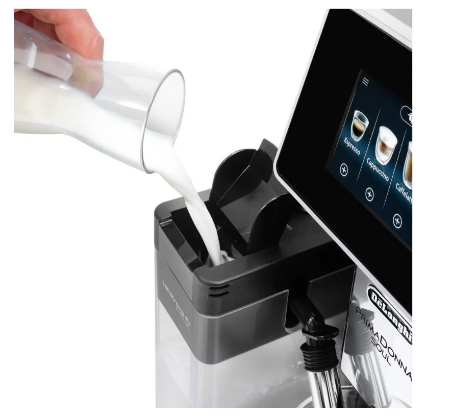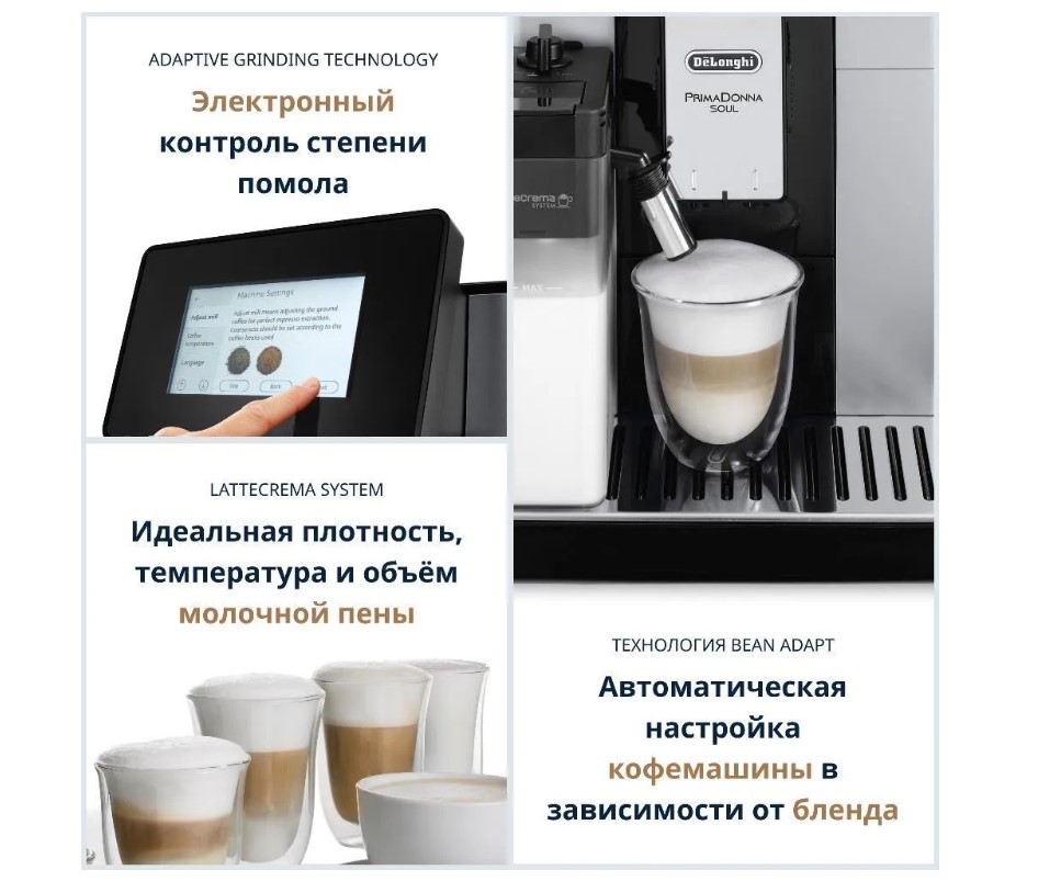Заказать кофе и получить за считанные минуты качественно приготовленный ароматный напиток можно не только в хорошей кофейне. Бункер для зерен вмещает в себя 500гр. Металлическая кофемолка с плоскими жерновами оснащена системой электронного контроля степени помола (Adaptive Grinding Technology). Кофемашина оснащена запатентованной технологией Bean Adapt – вы выбираете сорт кофе и степень обжарки, в программе есть возможность выбора арабики или робусты, а также 4-х степеней обжарки. Процесс настройки напитка сопровождается визуальными подсказками на дисплее кофемашины, либо на дисплее смартфона. После вашего выбора машина сама подбирает оптимальные настройки помола, темпирования и заваривания. В кофемашине доступны 18 предустановенных рецептов и 5 пользовательских профилей, благодаря которым, вы можете сохранять свои персональные настройки напитка в памяти кофемашины и управлять ими с помощью мобильного приложения Coffee Link. Благодаря запатентованной системе LatteCrema System кофеварка приготовит любой кофейно-молочный напиток с идеальным балансом кофе и молока. Теперь капучино, латте макиато или горячее молоко можно приготовить так же просто, как и стандартный эспрессо. Автоматическая кофемашина DeLonghi PrimaDonna Soul предлагает широчайшую кофейную карту, новые технологические решения и сдержанный классический дизайн. Эта кофемашина поможет раскрыть «душу кофе», ведь как следует из её названия – она для этого создана. За кофемашиной просто ухаживать: контейнеры для воды, гущи, лоток для сбора капель, узел подачи молока и заварочный блок съемные – их легко промывать. Для удаления накипи есть специальный цикл декальцинации, о необходимости его запуска оповестит индикатор.