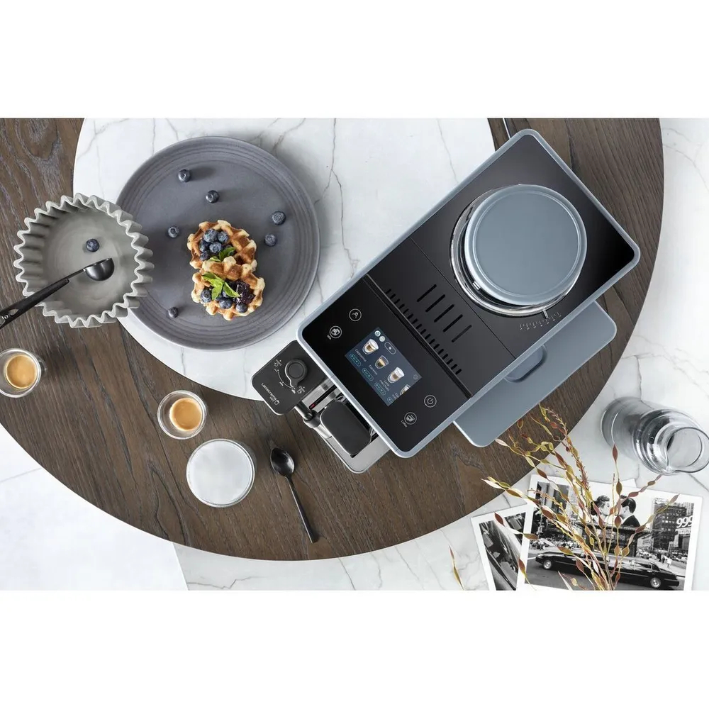 Кофемашина, контейнер для молока, мерный стаканчик для молотого кофе, тест-полоска для определения жесткости воды, руководство пользователя, гарантийный талон, фильтр для воды, сетевой кабель, средства для удаления накипи, 2 контейнера для кофе