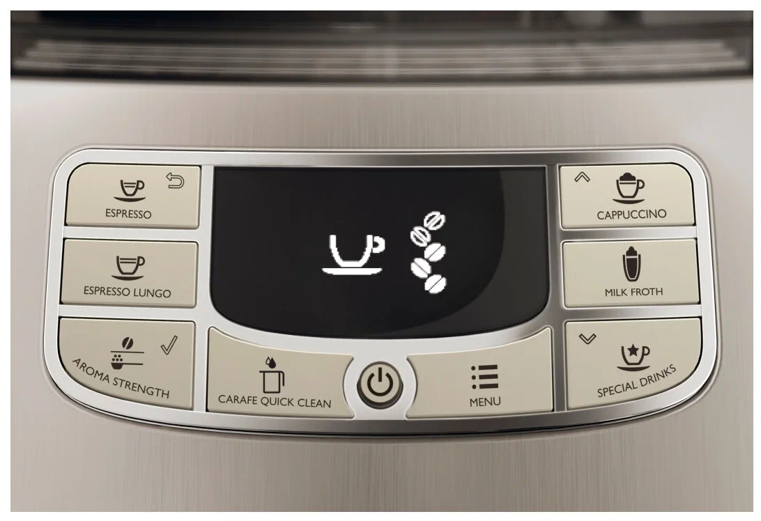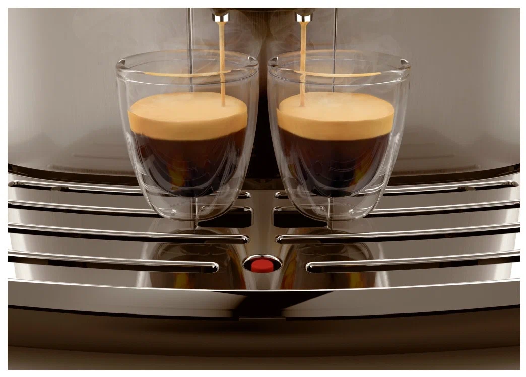 регулируемый по высоте диспенсер; энергосберегающий режим; контейнер для отработанного кофе на 10 порций; 10 степеней помола
