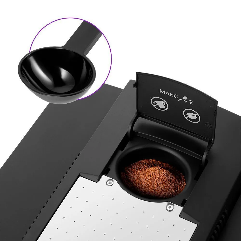 Помимо кофемолки, кофемашина КТ-7320 имеет ёмкость для молотого кофе. А для точности граммовки можете использовать специальную мерную ложечку, идущую в комплекте.