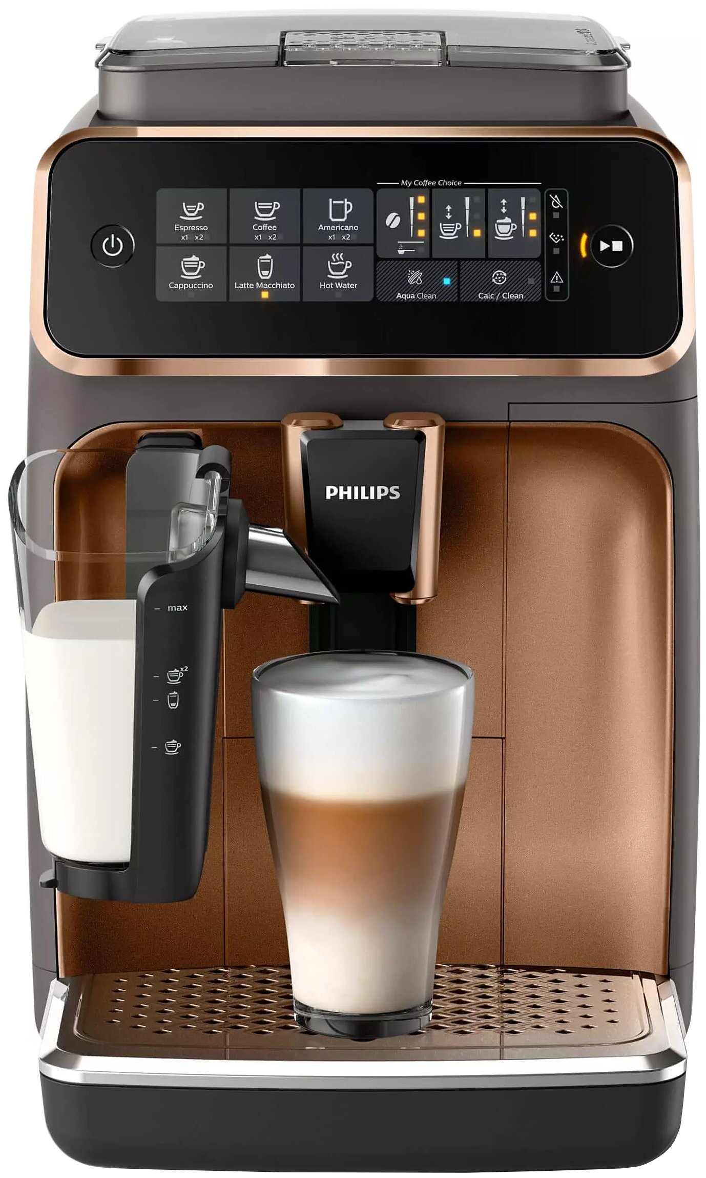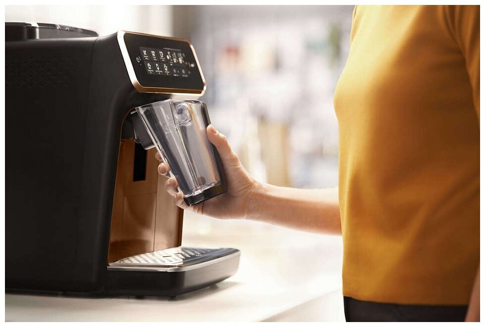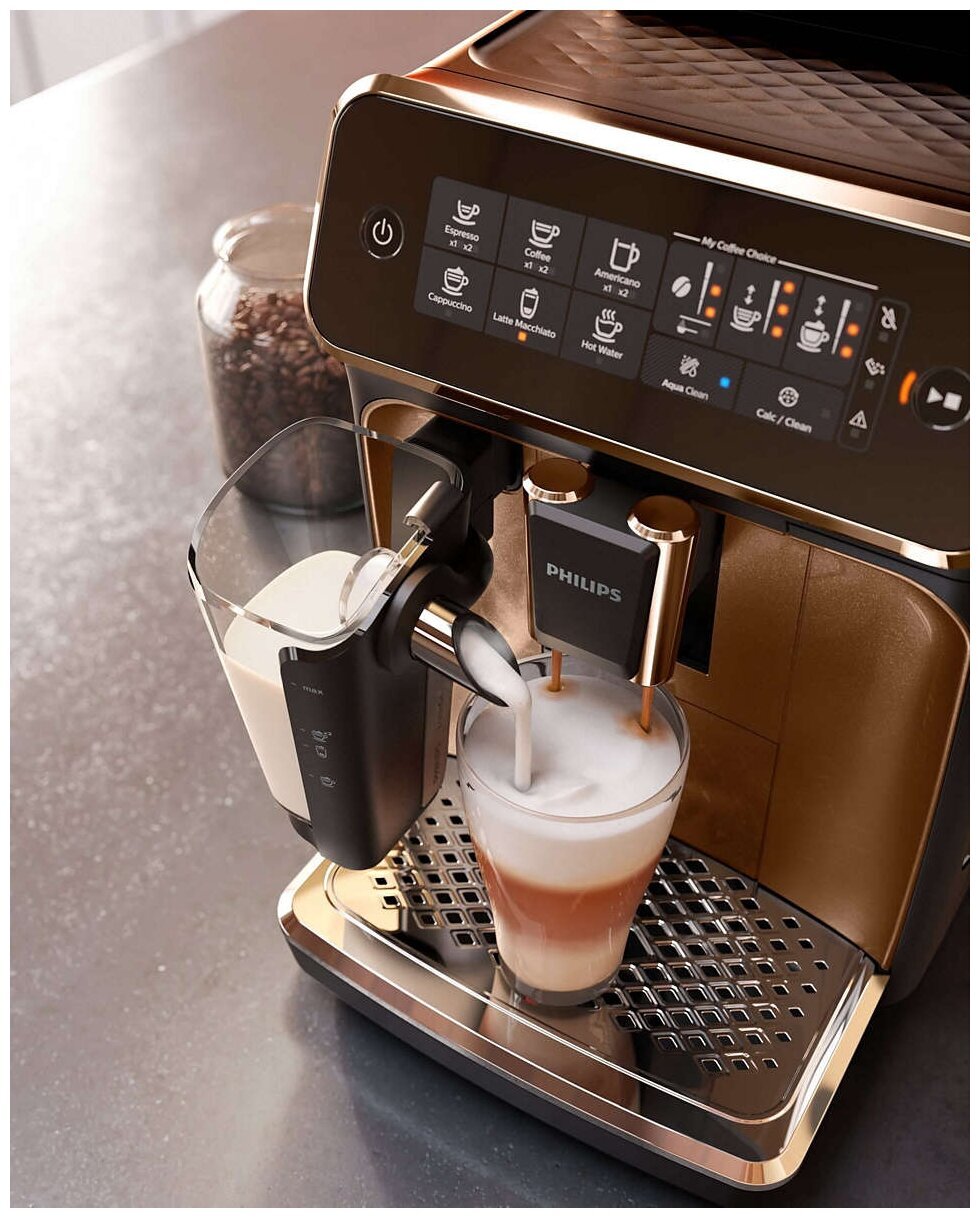уведомления о необходимости удаления налета, экорежим, класс энергоэффективности А, съемная варочная группа, 3 уровня крепости, 3 настройки температуры, длина сетевого шнура 100 см, емкость контейнера для отходов 12 порций, молочное решение LatteGo, регулируемый по высоте носик 85-145 мм, возможность очистки системы подачи молока, поддона для капель и контейнера для кофейной гущи в посудомоечной машине, доступ к контейнеру для отходов и емкости для воды с передней панели; в комплект вместе с устройством входят фильтр для воды AquaClean, тюбик со смазкой, мерная ложка, тестовая полоска для проверки жесткости воды, крышка для хранения LatteGo