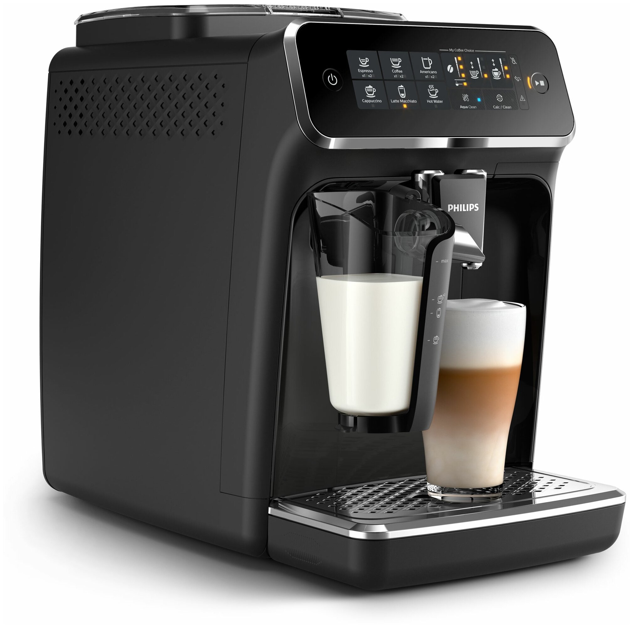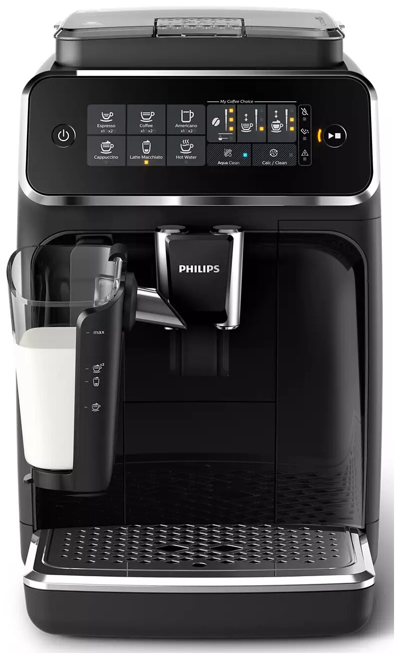 простое и быстрое удаление отходов; в комплекте: фильтр AquaClean, мерная ложка, тестовая полоска для проверки жесткости воды, крышка для хранения LatteGo, тюбик со смазкой; регулируемый по высоте носик 85 - 145 мм; емкость кувшина для молока 0.26 л; длина сетевого шнура 1 м