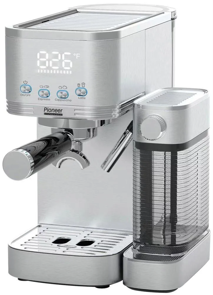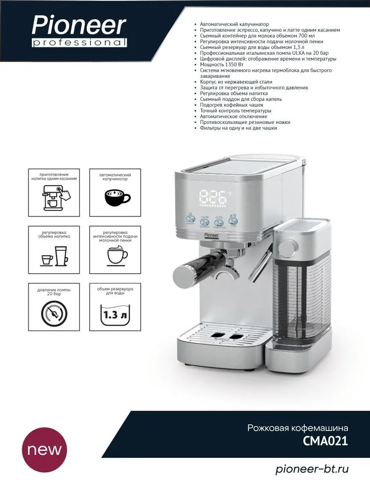 Рожковая кофемашина, Автоматический капучинатор, Приготовление эспрессо, капучино и латте одним касанием, Съемный контейнер для молока объемом 700 мл, Регулировка интенсивности подачи молочной пенки, Съемный резервуар для воды объемом 1,3 л, Профессиональная итальянская помпа ULKA на 20 бар, Цифровой дисплей: отображение времени и температуры, Мощность 1350 Вт, Система мгновенного нагрева термоблока для быстрого заваривания, Корпус из нержавеющей стали, Защита от перегрева и избыточного давления, Регулировка объема напитка, Съемный поддон для сбора капель, Подогрев кофейных чашек, Точный контроль температуры, Автоматическое отключение, Противоскользящие резиновые ножки, Фильтры на одну и на две чашки