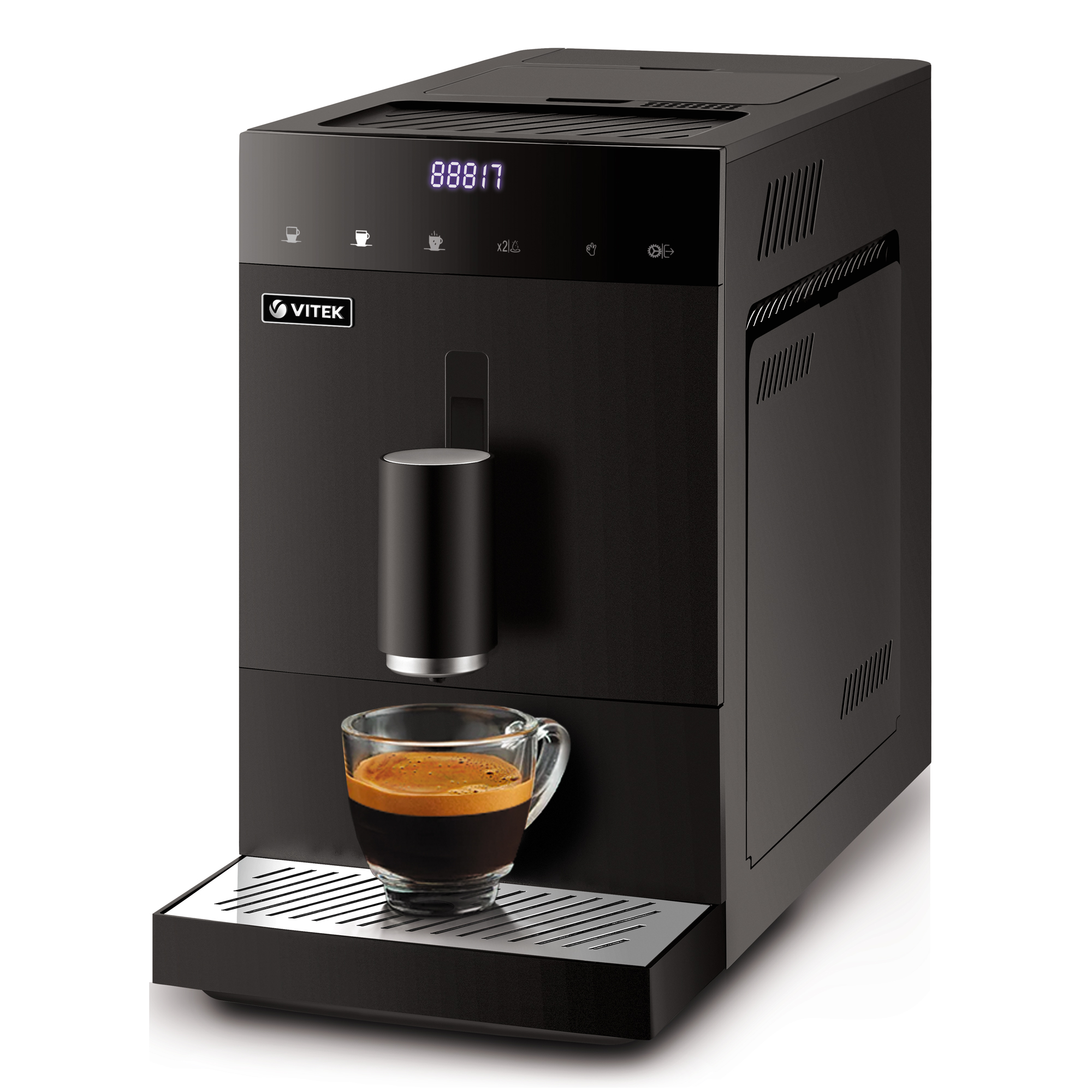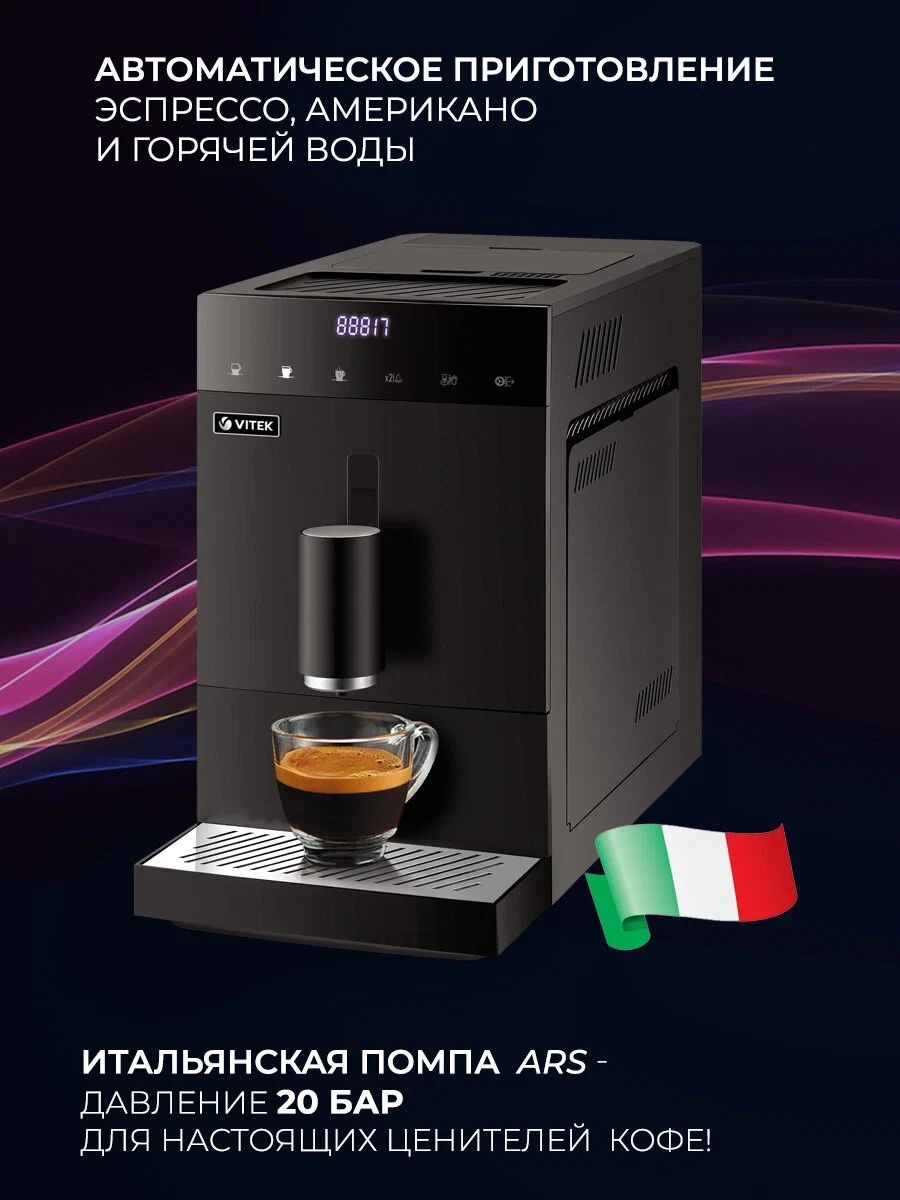Начните утро с чашечкой любимого напитка, приготовленного в кофемашине VITEK VT-8700, и ваш день точно будет добрым. Сенсорное управление делает использование устройства невероятно легким: нагреть воду, приготовить эспрессо или американо можно нажатием одной кнопки на LED-дисплее. Помпа итальянской фирмы ARS обеспечивает давление 20 бар, благодаря чему напитки имеют яркий вкус и головокружительный аромат. Измельчать зерна отдельно не придется, так как прибор оснащен встроенной жерновой кофемолкой с пятью степенями помола (емкость контейнера составляет 100 г).