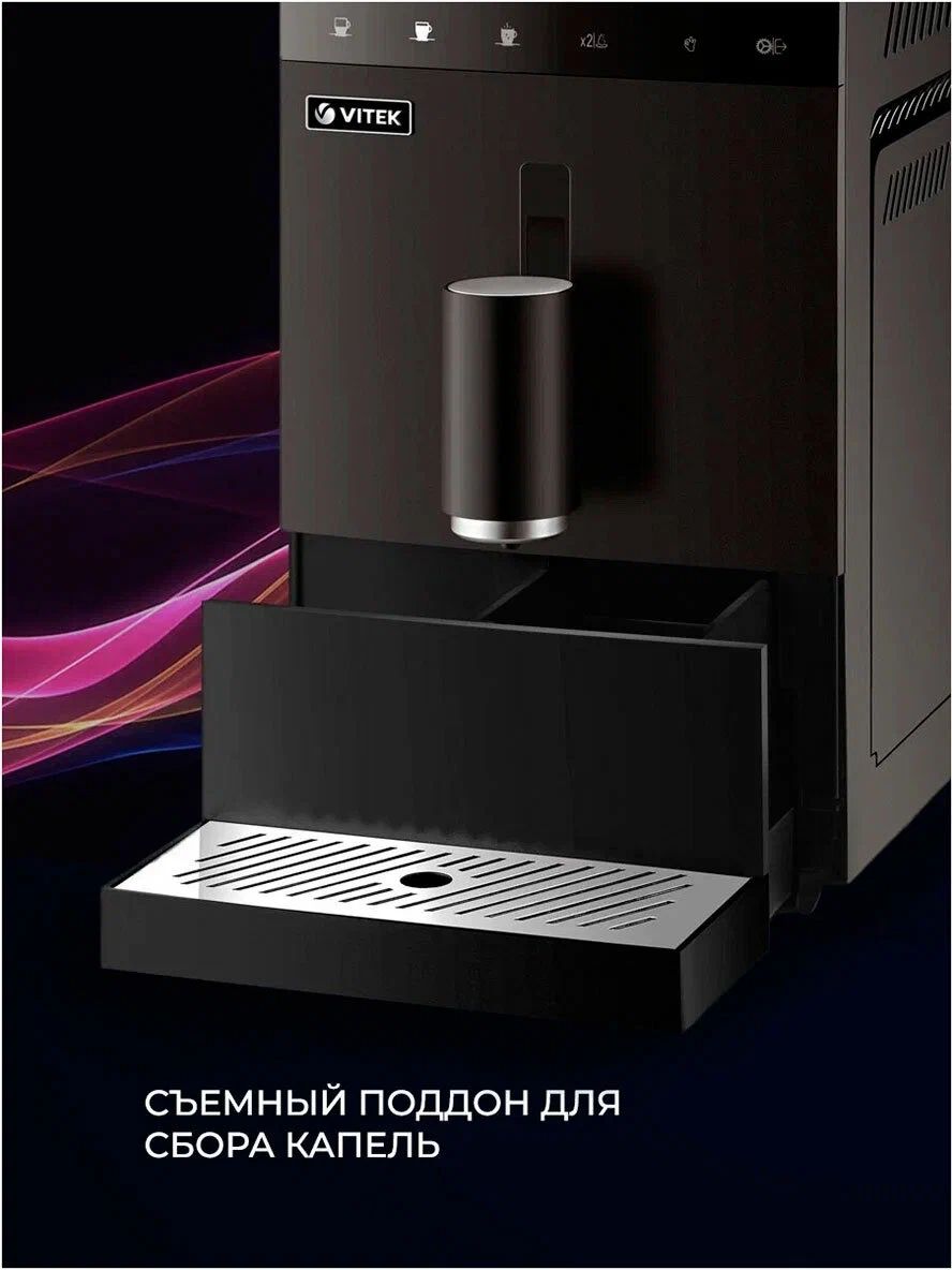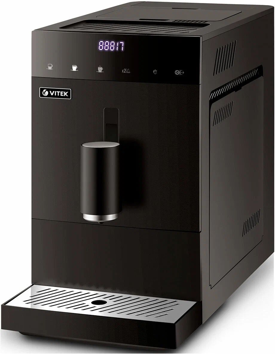 Объем, температуру и крепость напитка можно выбрать самостоятельно — нажатием на определенные кнопки. Высота дозатора под разные чашки (80–145 мм) регулируется механически. Чтобы подогреть чашки перед приготовлением кофе, просто поместите на специальную площадку и через пару минут снимите. Для особого комфорта в использовании кофемашина оборудована съемным резервуаром для воды емкостью 1,2 л и съемным поддоном для капель. Автоматическая очистка системы способствует продлению срока службы прибора. Мощность 1350 Вт гарантирует мощное давление и быстроту приготовления напитков. Купите автоматическую кофемашину VITEK VT-8700: сделайте свою жизнь еще более комфортной и приятной!