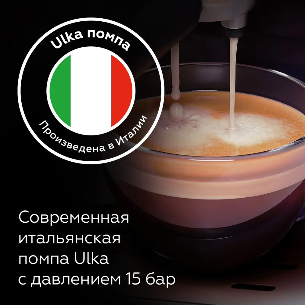 Сочетание в кофеварке мощности 850 Вт и итальянской помпы ULKA создающей давление в 15 Бар передадут весь аромат кофе.
