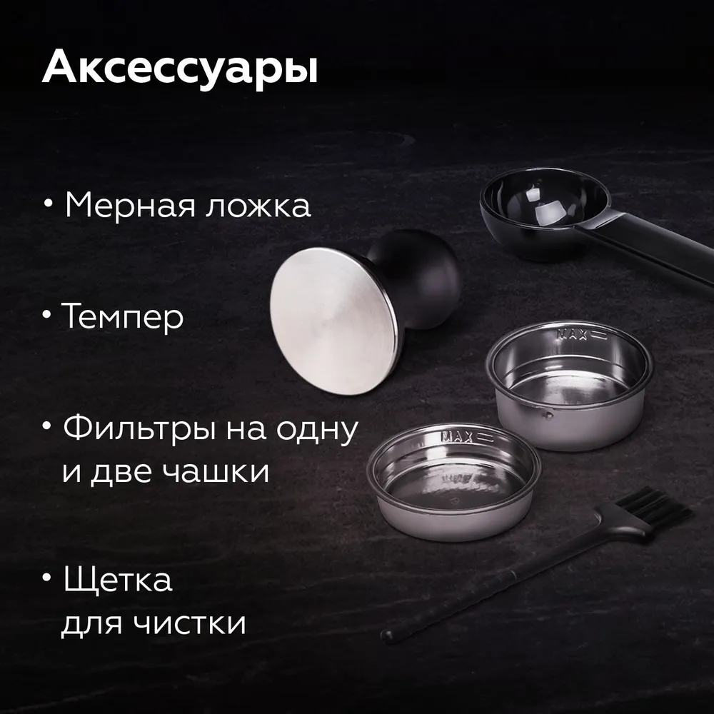 Кофейная станция - 1 шт; Мерная ложка - 1 шт; Темпер - 1 шт; Металлические фильтры для кофе - 2 шт; Щетка для чистки - 1 шт; Руководство по эксплуатации и гарантийный талон - 1 шт