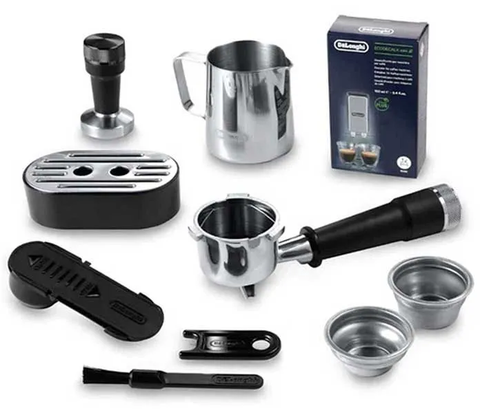 Кофеварка, подставка для небольших чашек, темпер, питчер, фильтры, кисть, игла для чистки, мерная ложка