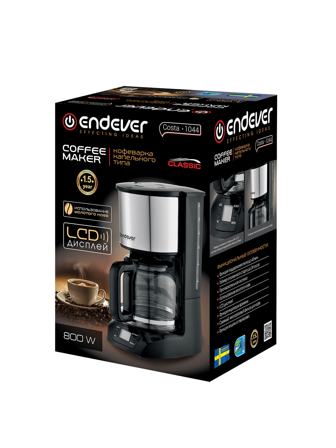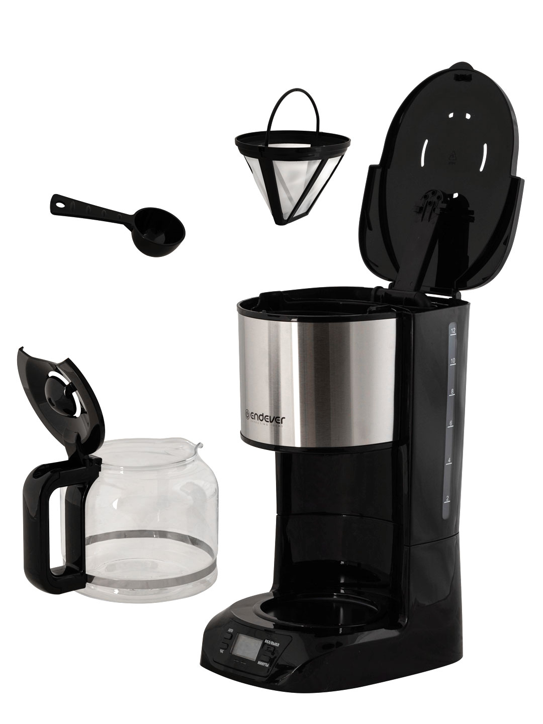 Тип кофеварки: капельный, Тип используемого кофе: молотый, Функция защиты от перегрева, Материал сетки фильтра: нейлон, LCD дисплей, Таймер отложенного старта до 24 часов, Функция индикации времени, Съемный многоразовый фильтр для кофе