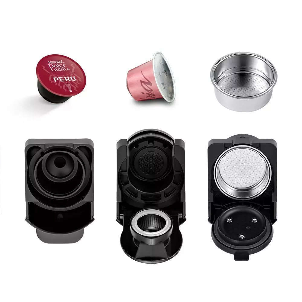Благодаря 3 адаптерам, которые входят в комплект, кофеварка подходит для капсул типа Nespresso и Dolce Gusto, а также для молотого кофе. Она прекрасно совмещает в себе все преимущества каждого типа кофеварок и готовит под давлением 19 бар.