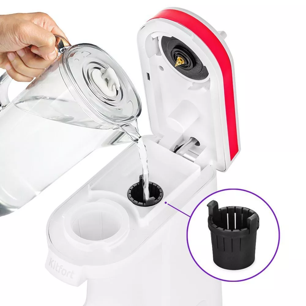 Резервуар для воды несъёмный. Чтобы наполнить его водой, откройте крышку и залейте от 100 до 360 мл воды. В отверстие для добавления воды вставлен многоразовый фильтр, который предотвращает попадание кофе или других предметов в резервуар.