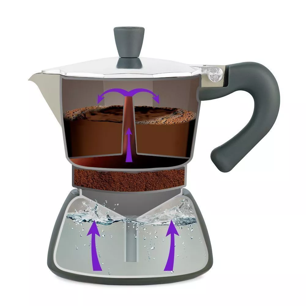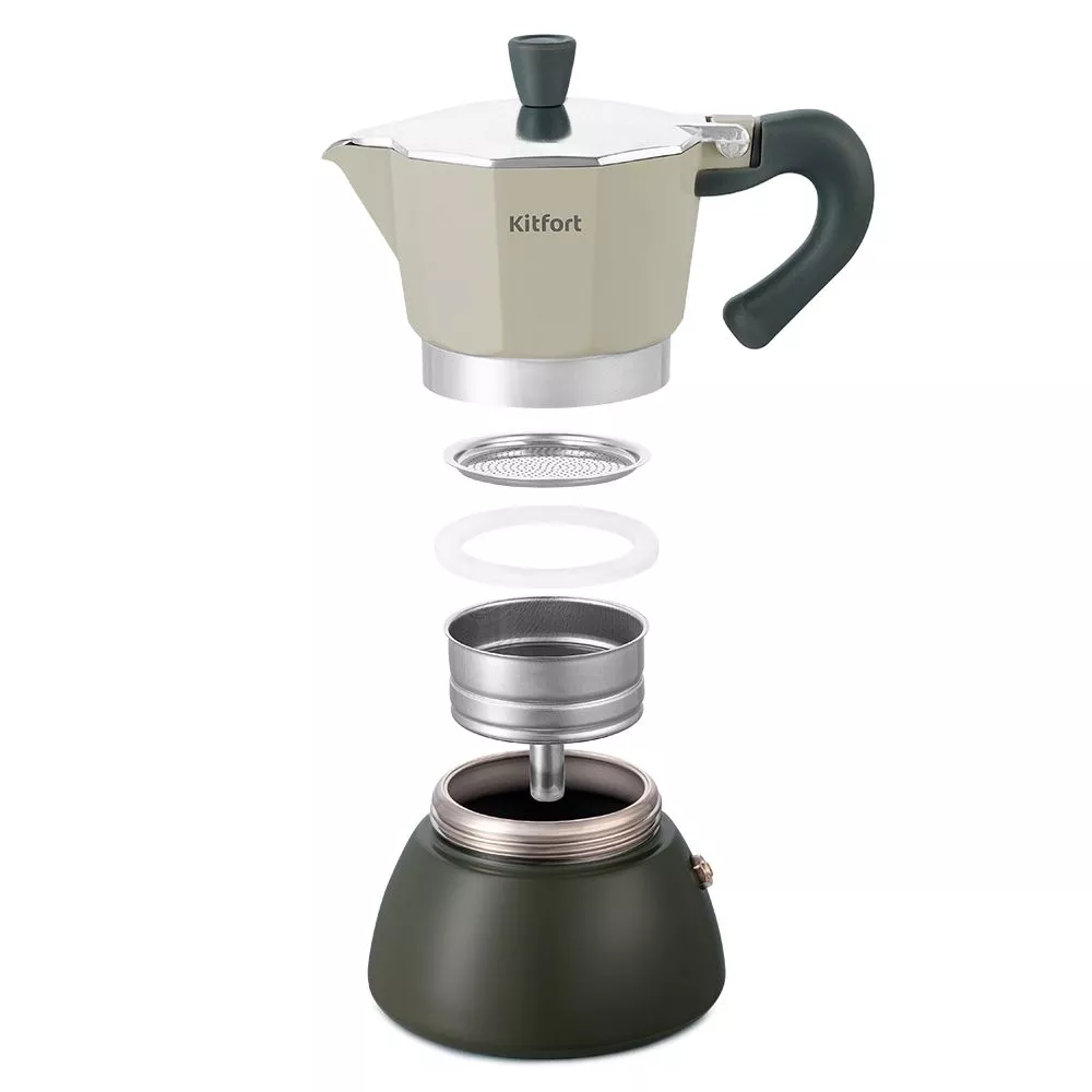 В воронку с фильтром кофеварки KT-7150 помещается около 15 грамм кофе, а ёмкость резервуара для воды— 150 мл. Она рассчитана на приготовление 3 чашек кофе по 40 мл. Преимущество гейзерной кофеварки в простоте приготовления кофе.