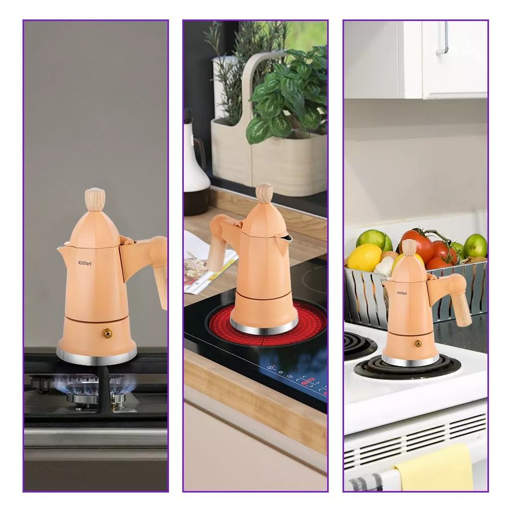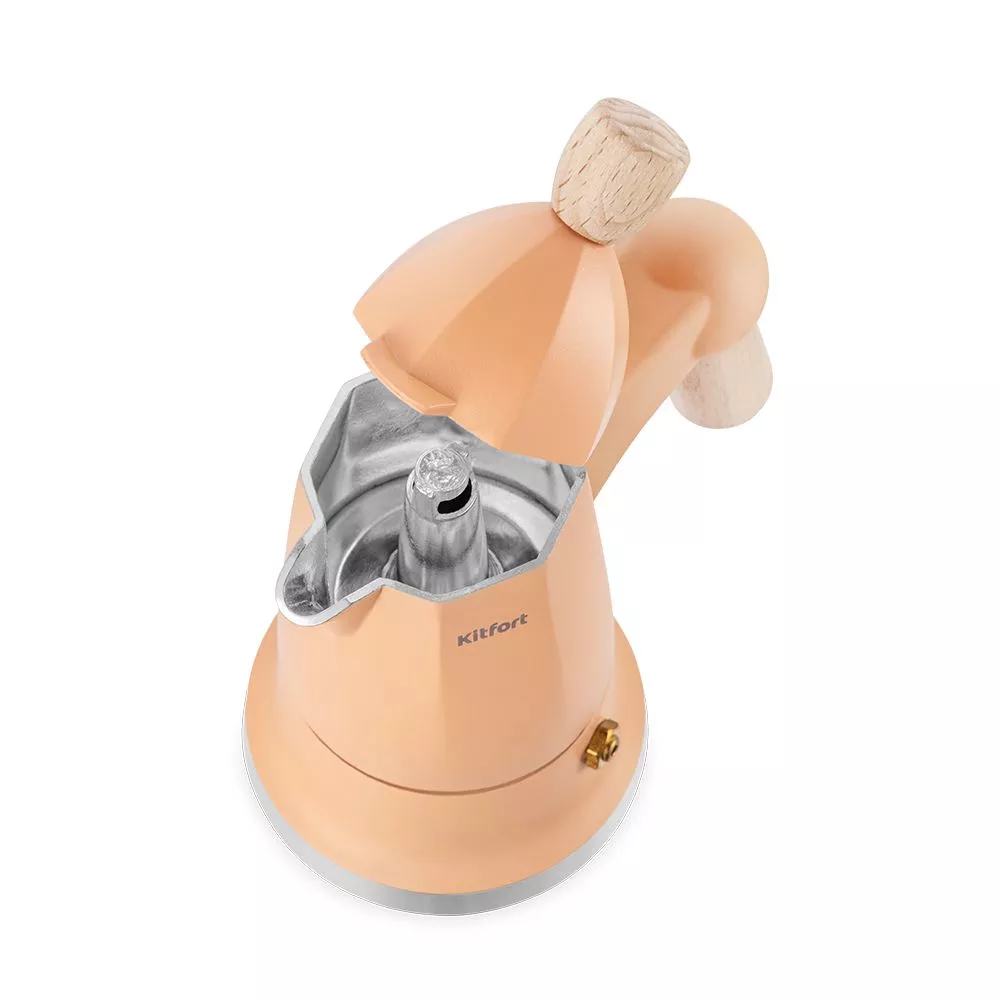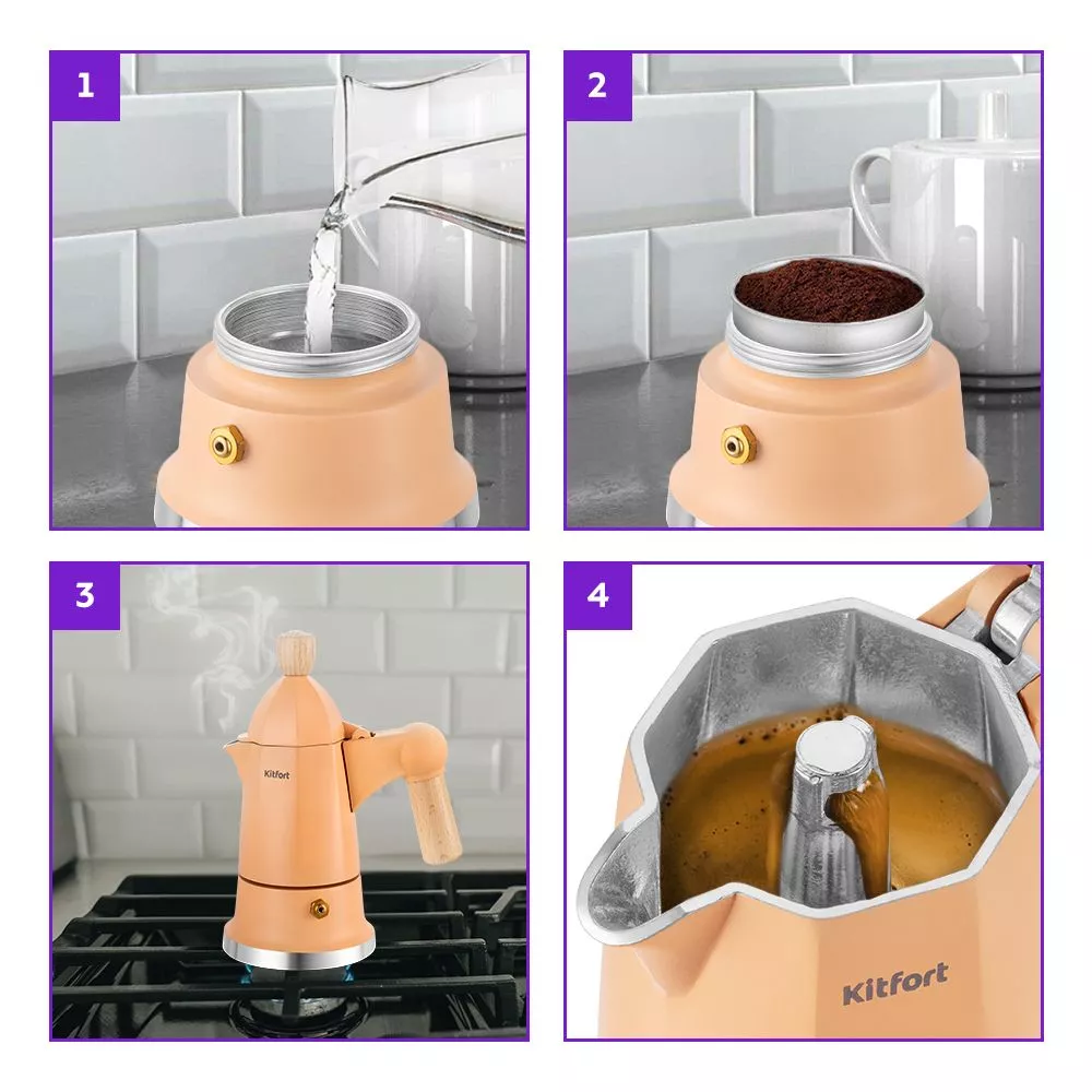 С гейзерной кофеваркой нет необходимости следить за подъёмом пенки, а готовый кофе не содержит гущи. KT-7152 рассчитана на приготовление до 40 мл кофе. Воронка фильтра вмещает 7 г кофе, а резервуар для воды - 70 мл. Корпус выполнен из алюминия.