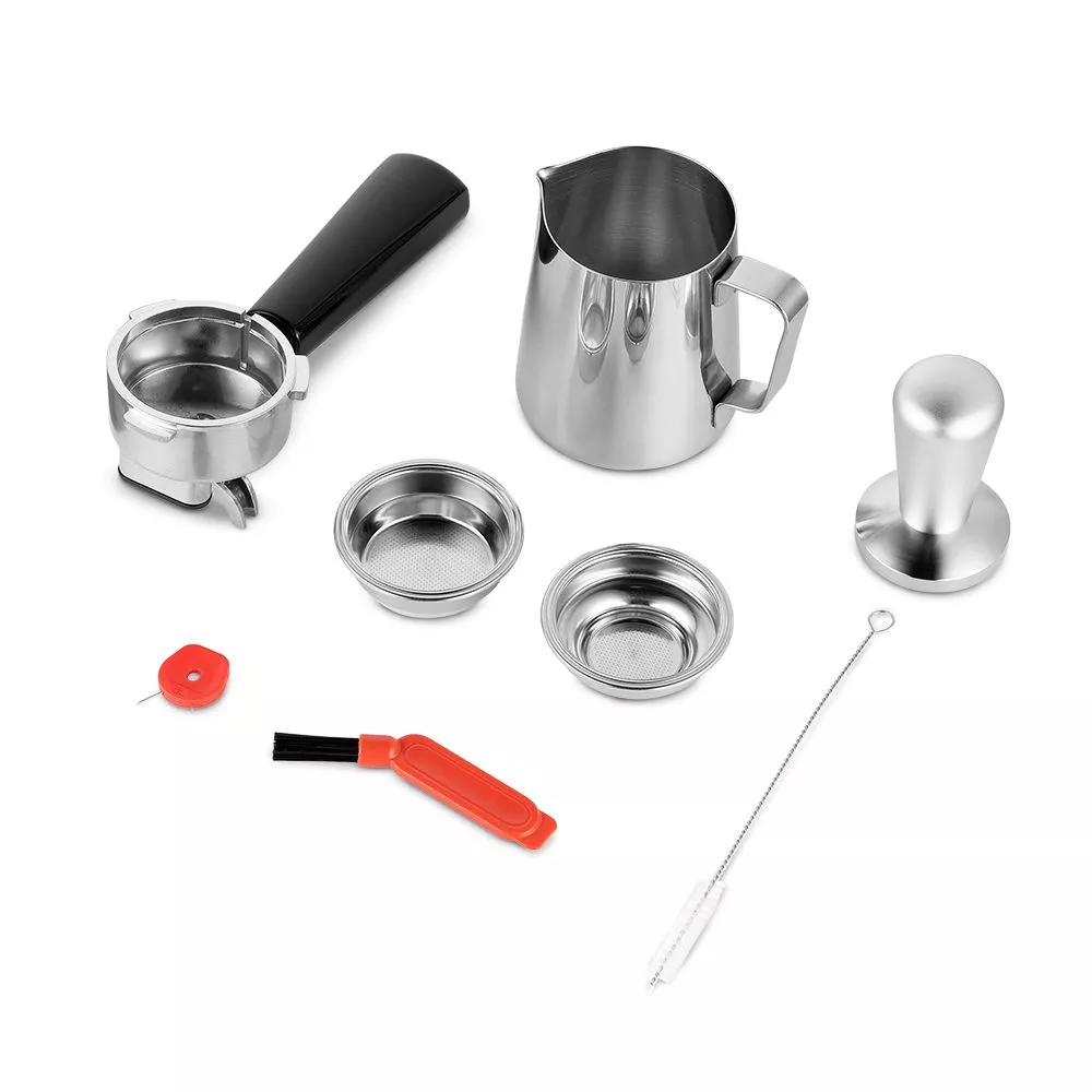 В комплекте к кофейной станции идут 2 фильтра, рожок, темпер, питчер, кисточка, ёршик для чистки. Все комплектующие выполнены из надёжных материалов. Поддон для сбора капель с решёткой легко снимается, моется и устанавливается обратно.