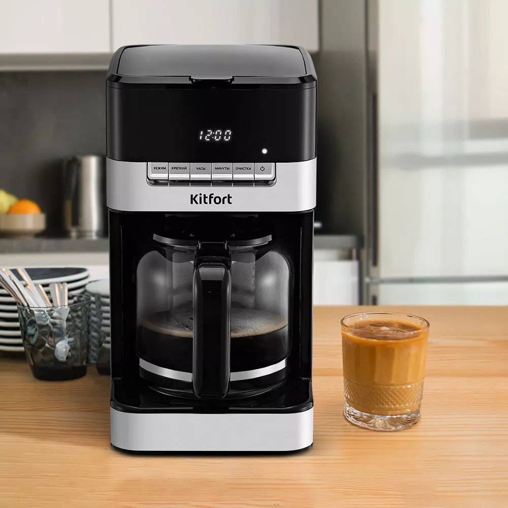 Капельная кофеварка КТ-7203 готовит ароматный чёрный кофе из молотого кофе. Вы можете выбирать крепость кофе при приготовлении.