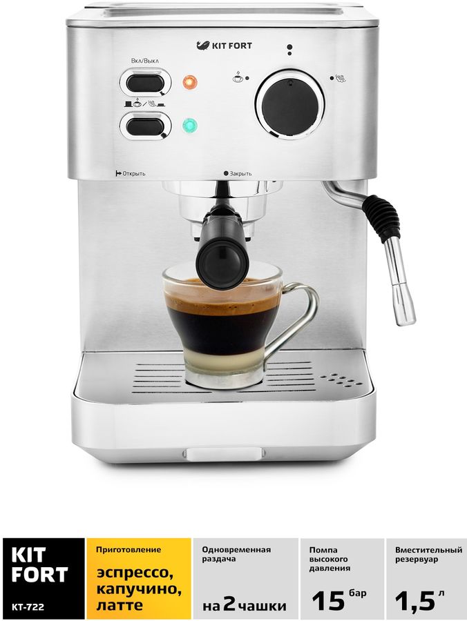 тип кофеварки: капельная, мощность: 1050 Вт, давление помпы: 15 Бар, тип кофе- молотый/чалды, материал корпуса- нержавеющая сталь