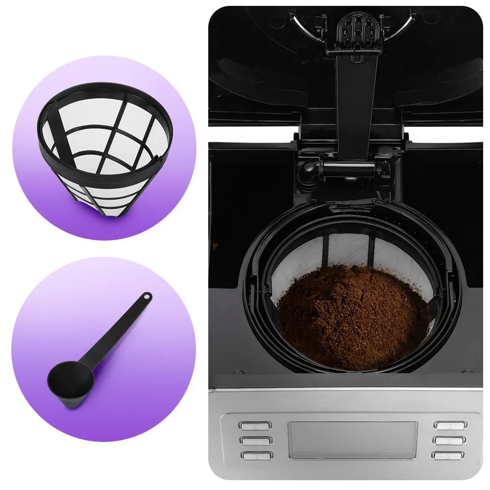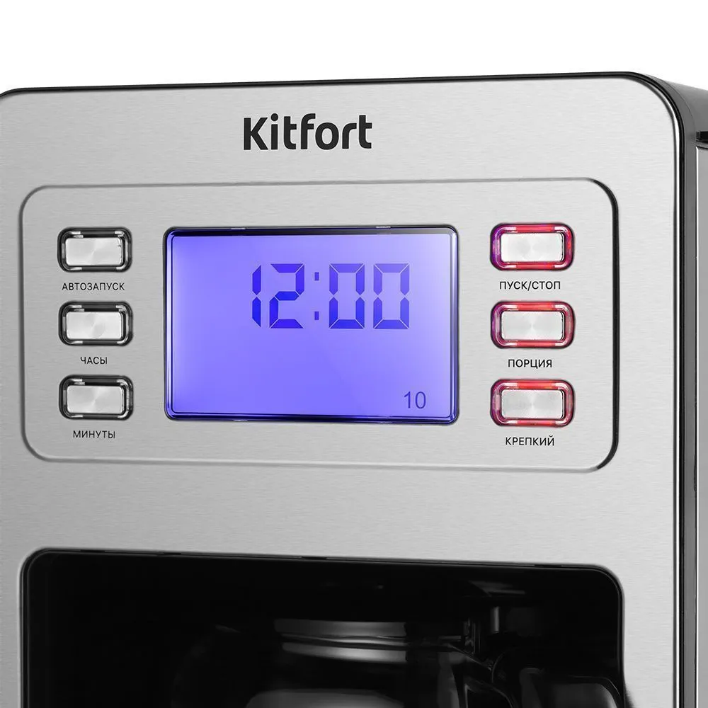 Управление кофеваркой осуществляется при помощи кнопок на панели управления. На дисплее видно текущее время, выбранный режим и время подогрева. «Отложенный старт» позволит вам начать приготовление кофе к заданному времени.