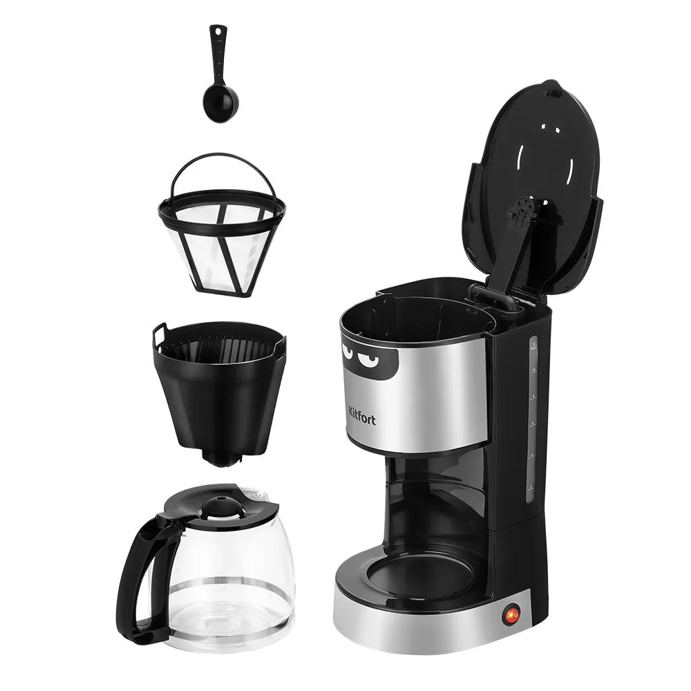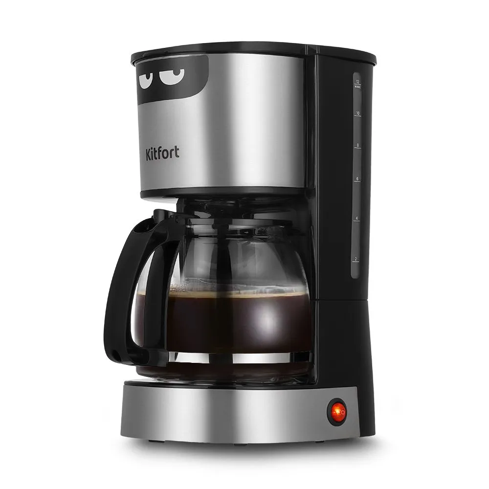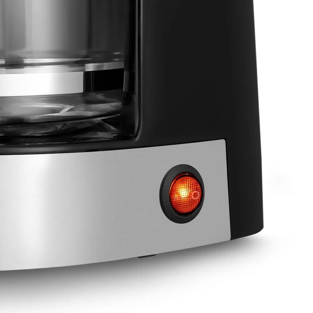 Управление кофеваркой осуществляется всего одной кнопкой на боковой панели. От вас потребуется лишь засыпать кофе в фильтр, а остальной процесс заваривания прибор выполнит сам.