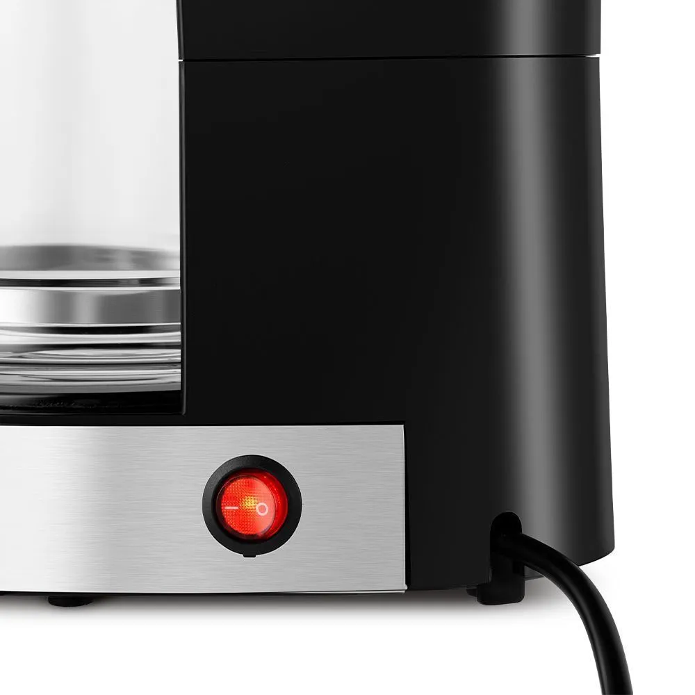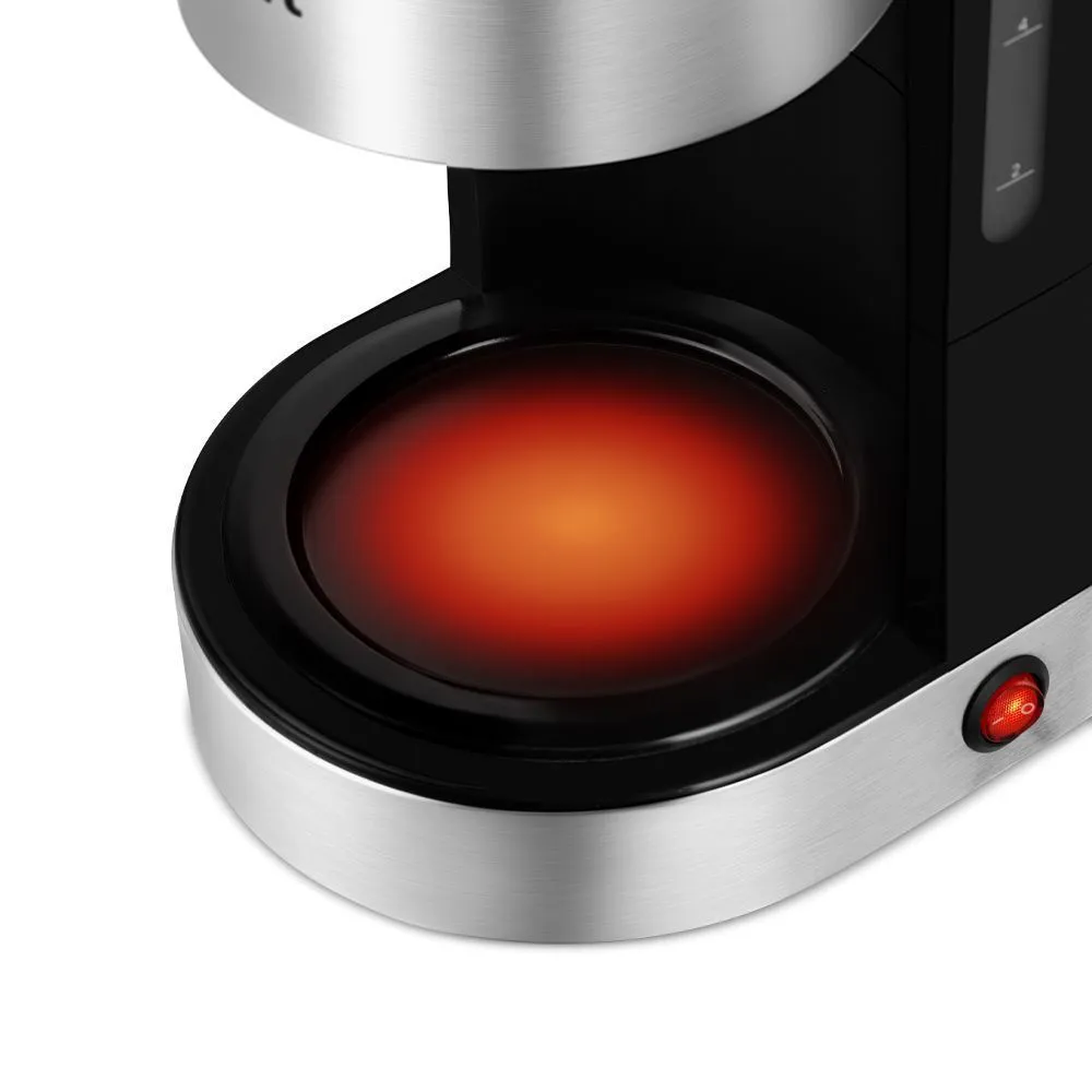 Управление кофеваркой осуществляется всего одной кнопкой на боковой панели. От вас потребуется лишь засыпать кофе в фильтр, а остальной процесс заваривания прибор выполнит сам.