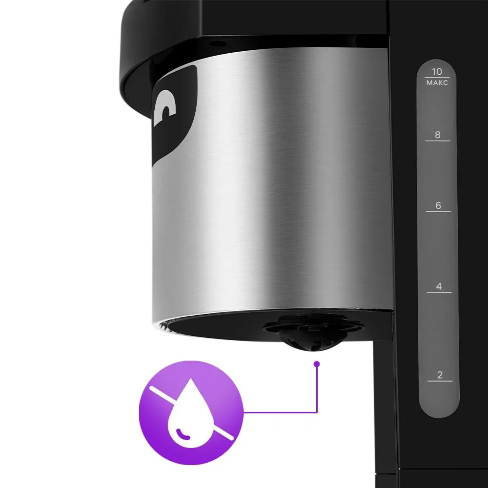 Кофеварка оборудована противокапельной системой - затвором, приостанавливающим подачу кофе при вынимании кофейника из кофеварки. Вы можете налить кофе в чашку, не дожидаясь окончания приготовления.