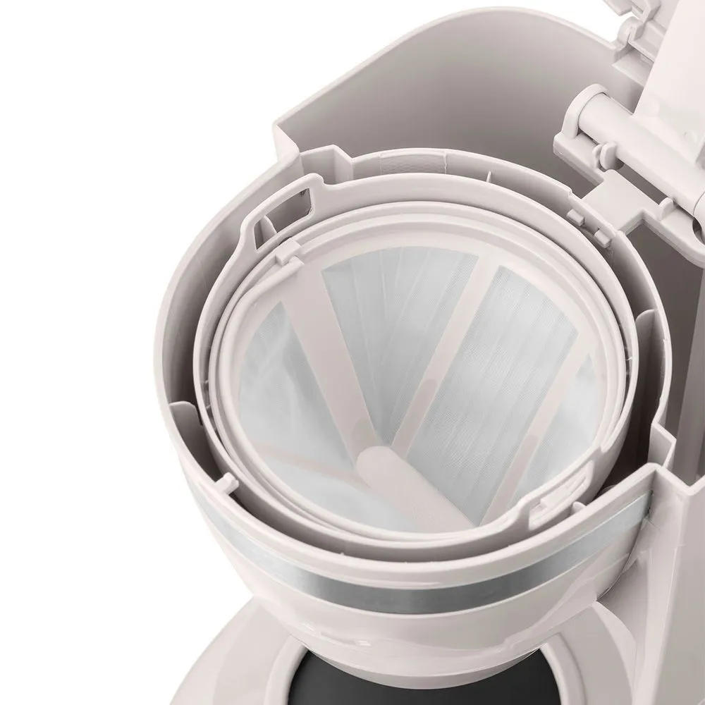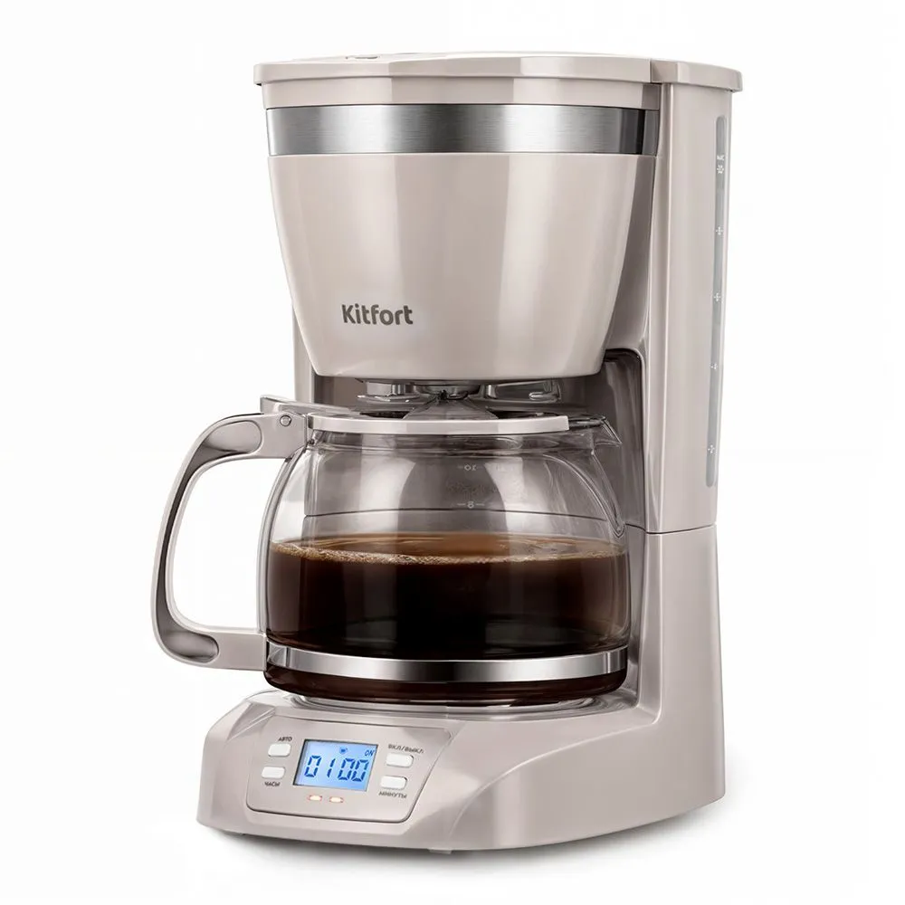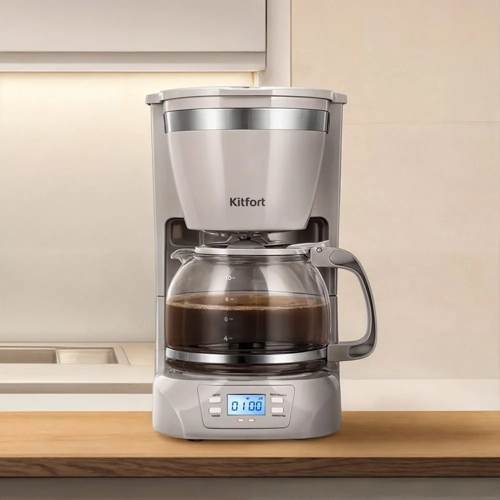 Управление кофеваркой осуществляется всего одной кнопкой на боковой панели. От вас потребуется лишь засыпать кофе в фильтр, а остальной процесс заваривания прибор выполнит сам.