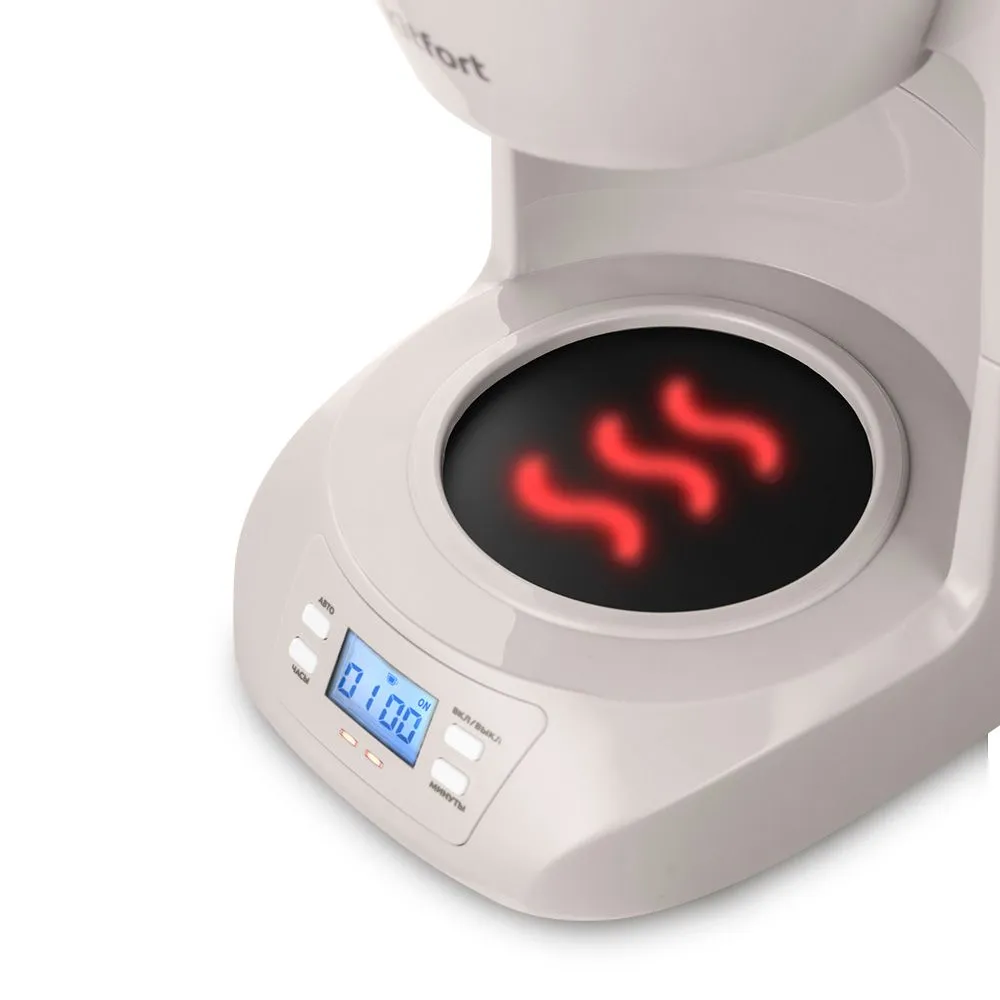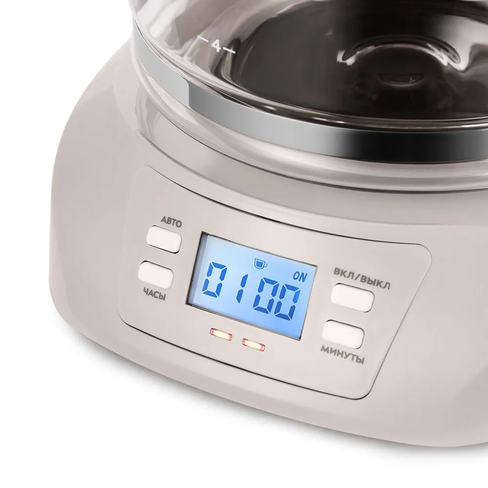 Платформа, на которой стоит кофейник с готовым кофе, имеет постоянный не отключающийся подогрев.