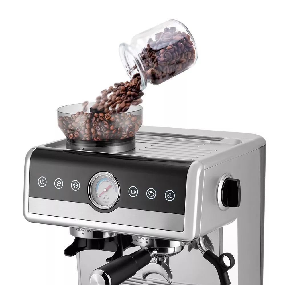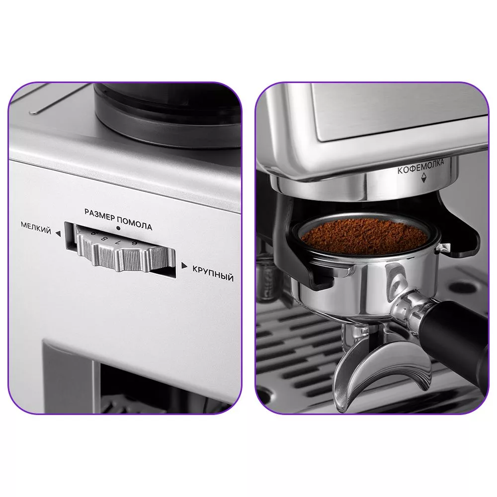 Встроенная кофемолка с коническими металлическими жерновами позволяет качественно измельчать кофейные зёрна перед приготовлением кофе, что положительно отражается на вкусе готового напитка.