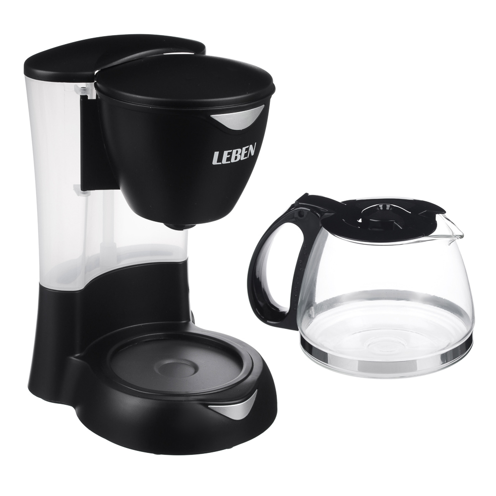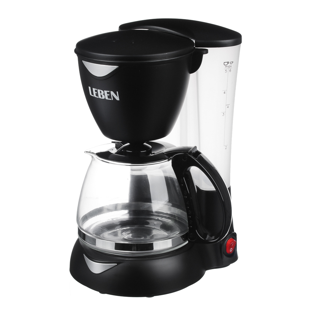 Капельная кофеварка Leben готовит 6 чашек ароматного кофе за 1 цикл работы. Чаша объемом 650 мл выполнена из жаропрочного стекла. Гигиеничный материал не меняет вкус напитка и не боится высоких температур. Капельная кофеварка Leben оснащена функцией подогрева. А это значит, что бодрящий кофе дольше остается горячим после приготовления. Чтобы вам было удобно отслеживать количество порций, резервуар для воды имеет деления.