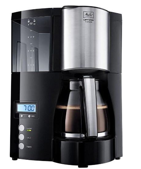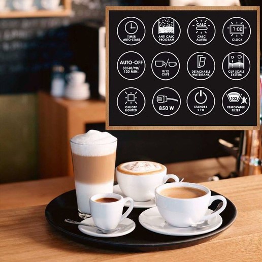 Программирование начала процесса приготовления кофе. Рассчитана на 2-8 чашек кофе. Программа настройки на четыре степени жесткости воды. Программирование автоматического отключения (30-60-90-120 мин). Выдвижной фильтр. Гнездо для сетевого шнура. Часы. Декальцинация одной кнопкой.