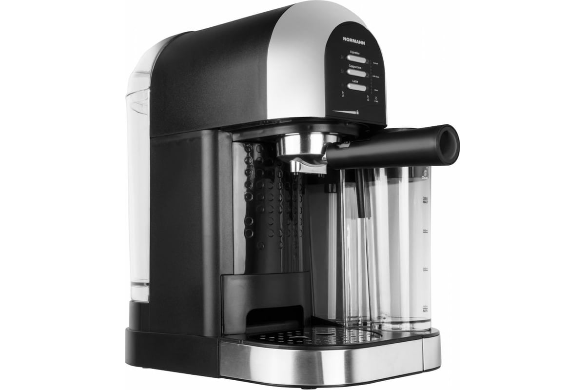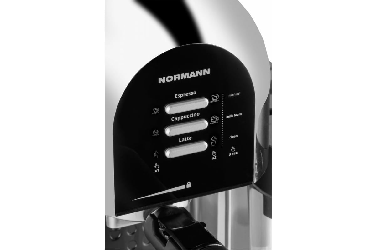 Кофеварка NORMANN ACM-526 – рожкового типа с электронным управлением – приготовление порции напитка в одно нажатие. Режимы: эспрессо (одна порция), эспрессо (двойная порция), капучино (маленькая порция), капучино (большая порция), латте (маленькая порция), латте (большая порция), ручной режим, приготовление молочной пены, режим очистки.