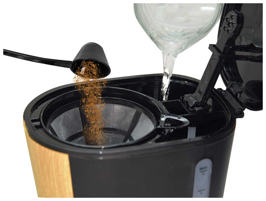 Стеклянный кувшин ёмкостью 1,25 л позволяет получить одновременно 10 порций кофе. По окончании работы, кофеварка поддерживает режим подогрева в течение 60 минут. Для этого необходимо оставить кувшин с напитком на подставке подогрева, убедившись, что кнопка включения находится в режиме работы. Для приготовления кофе с максимально насыщенным ароматом рекомендуется использовать зерна мелкого помола.