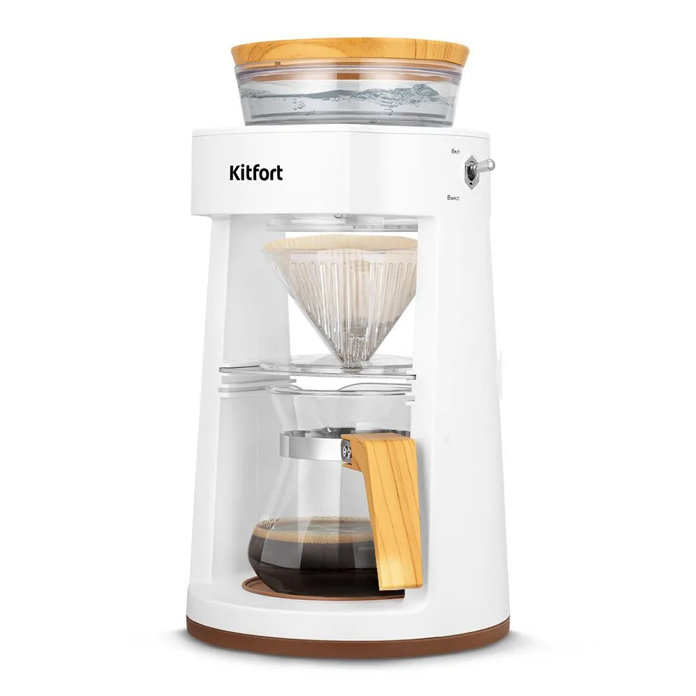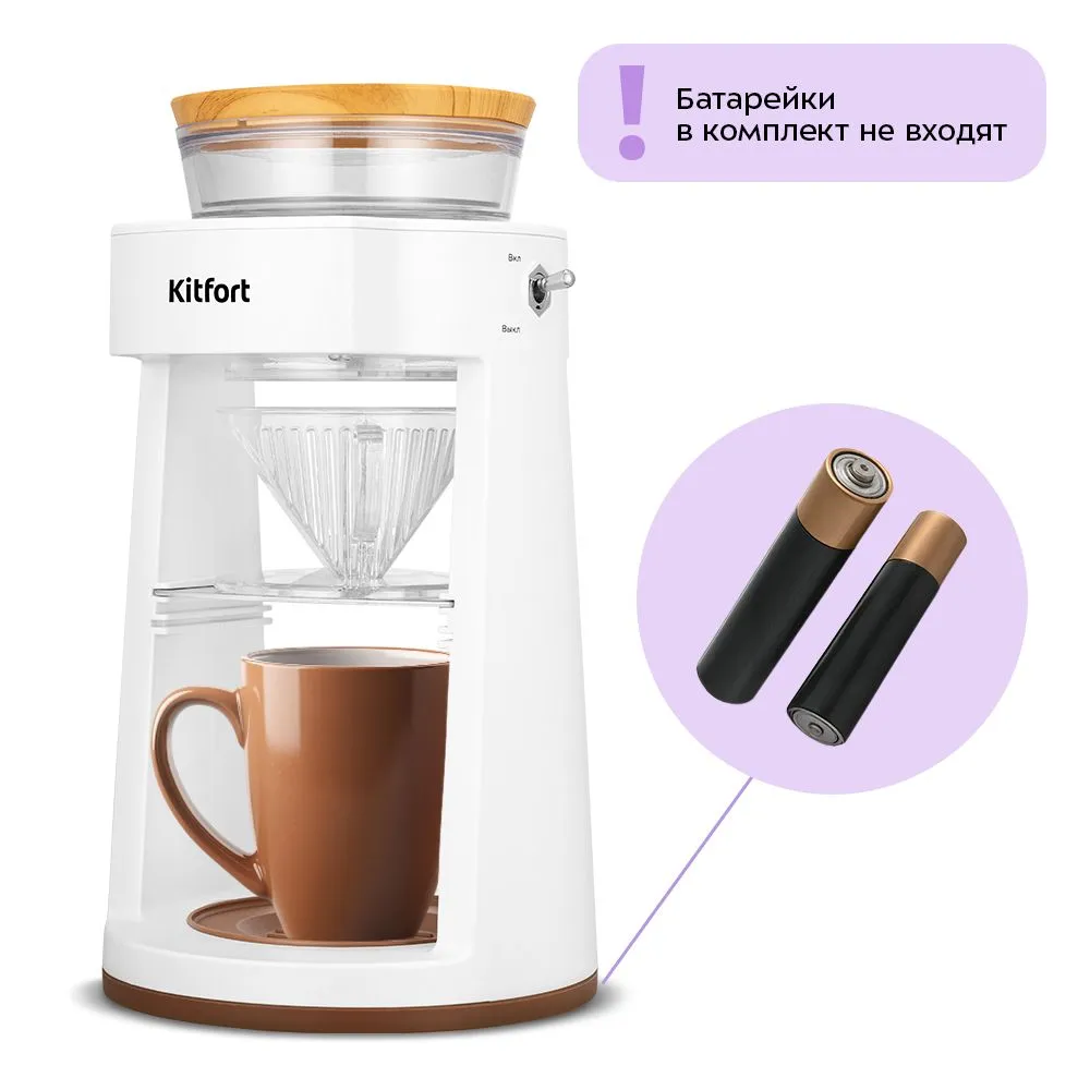 Портативная кофеварка-пуровер КТ-7570 готовит ароматный кофе из молотых зёрен. Её особенность – воронка для пуровера (метод заваривания, когда вода проходит через кофе). В отличие от ручного способа, кофеварка проливает воду автоматически.