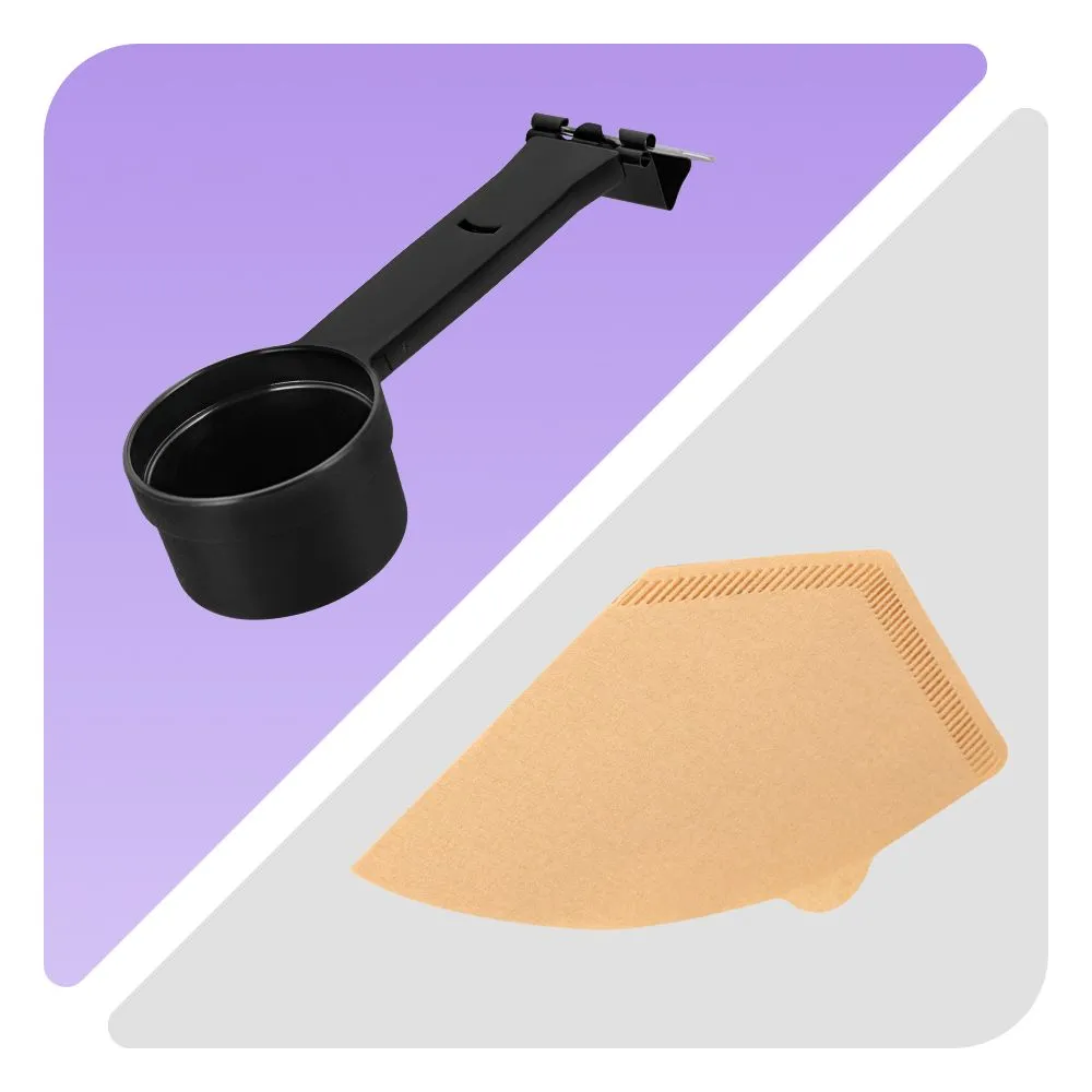 В комплекте – мерная ложка и 1 бумажный фильтр. Мерная ложка вмещает 10 грамм молотого кофе, на другом конце мерной ложки установлена прищепка, которой вы можете закрыть пакет кофе. При заваривании кофе не насыпайте в фильтр более 20 грамм молотого кофе.