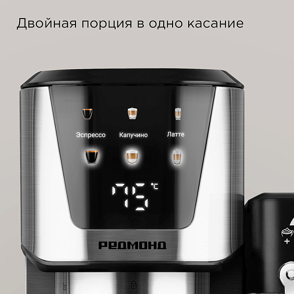 РЕДМОНД СМ715 — рожковая кофеварка для приготовления 3 напитков: эспрессо, латте и капучино, а также двойных порций этих напитков. Итальянская помпа Ulka создает высокое давление 15 бар как в профессиональных кофемашинах. Автоматический капучинатор подаст нежную молочную пену прямо в чашку. Электронный термометр поддерживает постоянную температуру на протяжении всего процесса заваривания, что обеспечивает насыщенный вкус каждой порции кофе.