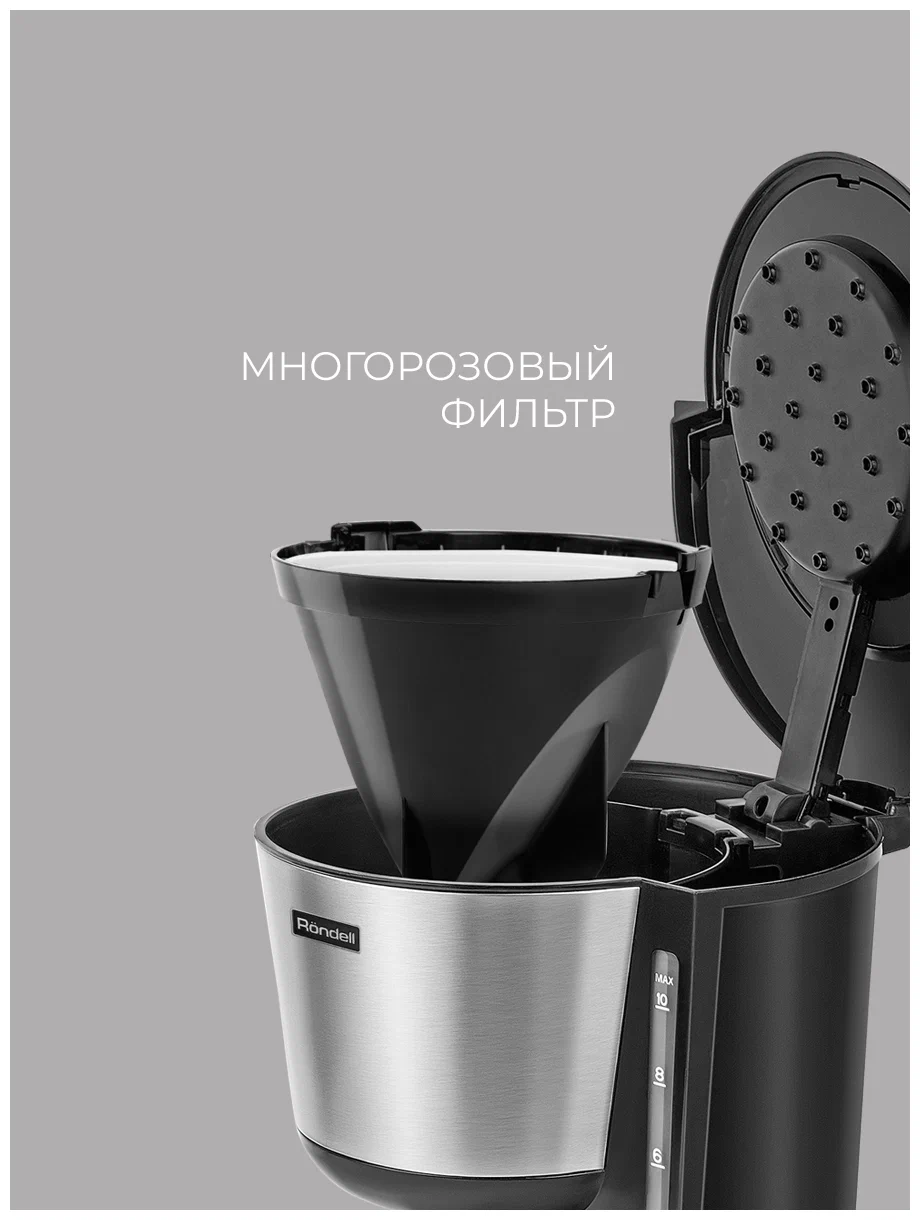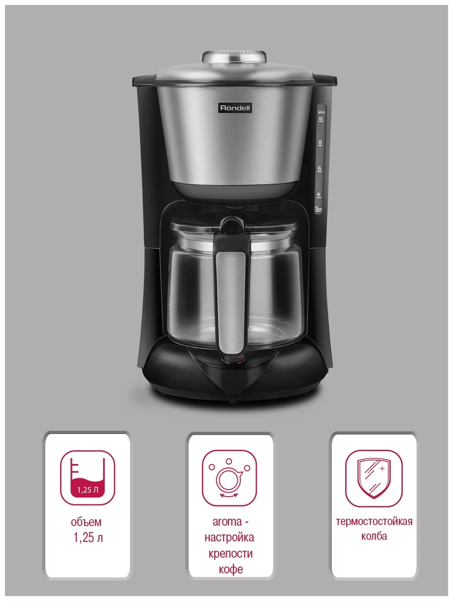материал кувшина: термостойкое стекло; комплектация: кофеварка, съемный держатель фильтра, съемный фильтр, колба для кофе, мерная ложка, инструкция