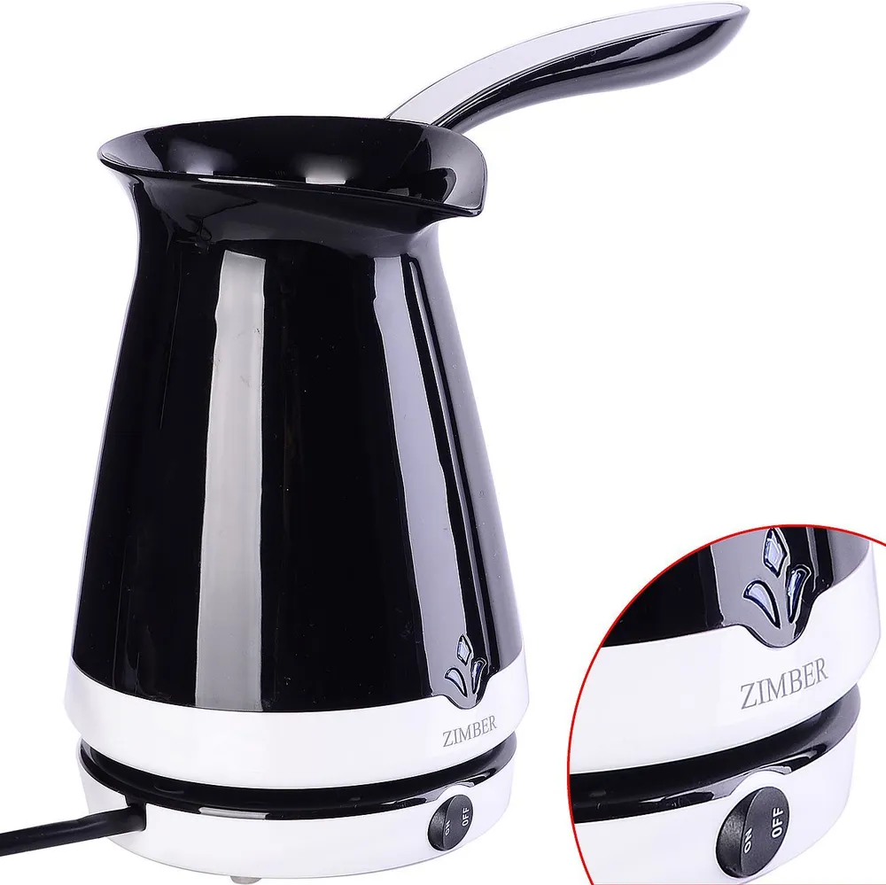 Электрическая кофеварка–турка ZIMBER - это современное, удобное и функциональное устройство для приготовления кофе. Что может быть лучше по утрам, чем чашечка этого крепкого бодрящего напитка! Далеко не всегда мы можем себе позволить тратить свое утреннее время на варку кофе в традиционной турке, но такая замечательная кофеварка-турка позволит значительно ускорить этот процесс и насладиться ароматом и вкусом любимого напитка! Кофеварка выполнена из качественного термопластика, нагревательным элементом прибора является пластина из нержавеющей стали. Стильная и удобная, такая турка украсит вашу кухню, а также станет замечательным подарком!