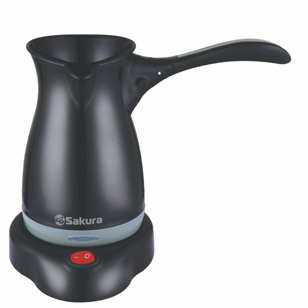 Турка электрическая. Объем 0.5 л, мощность 500 Вт, закрытый нагревательный элемент, складная ненагревающаяся ручка, защита от включения без воды, защита от перегрева; корпус: пластик.