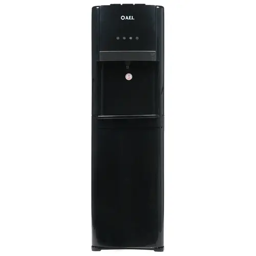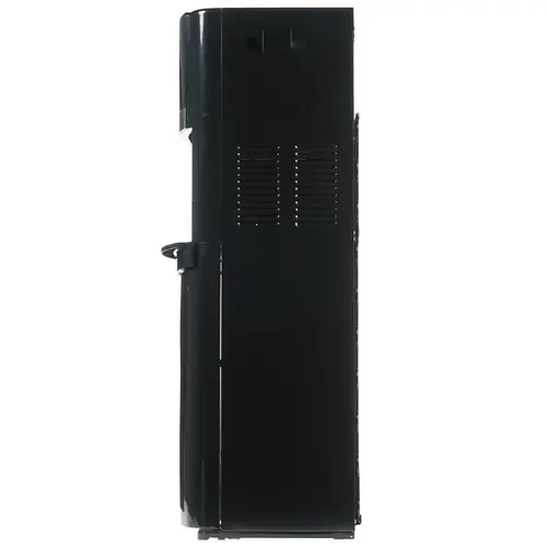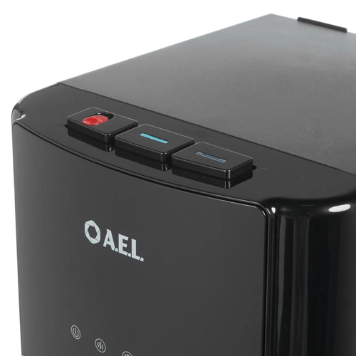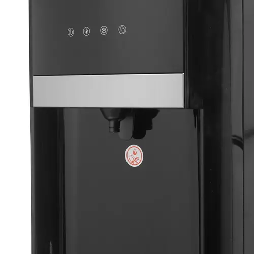 На передней панели есть датчики готовности горячей и холодной воды, подключения к сети и опустошения бутыли. Строгий дизайн и черный цвет корпуса прибора делают его интересным дополнением интерьера. Возможность отключать по отдельности компрессор и нагреватель понравится тем, кто стремится рационально расходовать электроэнергию.