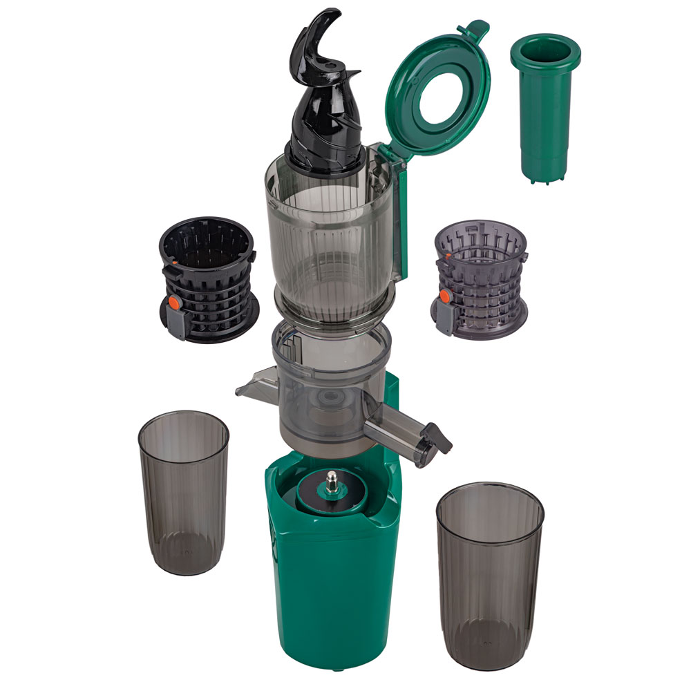 Мощный мотор, Скорость двигателя: 50 об./мин., Вертикальный высокопрочный шнек, Прорезиненные ножки для устойчивого размещения, Система защиты двигателя от перегрева, Прозрачная емкость для сока и мякоти, Экстра широкое загрузочное отверстие – 105 мм, Современный дизайн , Автоматическое деление сока от мякоти, Функция «капля-стоп», Безопасна и легка в использовании, Легкая сборка, Холодным отжим, Функция реверс