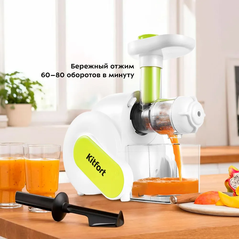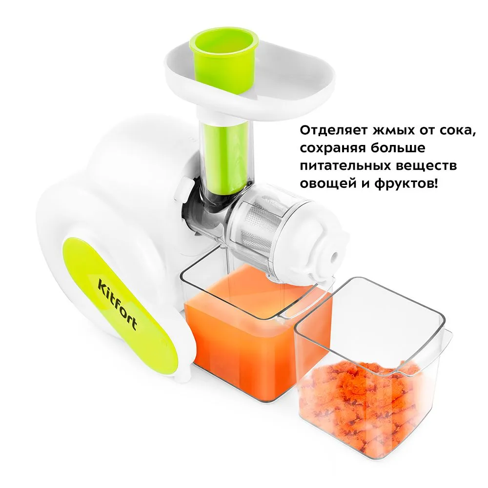 Шнековая соковыжималка Kitfort КТ-1110 позволяет отжимать сок из фруктов, овощей и зелени. 80-100 об/мин — оптимальная скорость вращения шнека для бережного отжима. Сок не нагревается и не окисляется, сохраняя все витамины, аминокислоты и минералы.