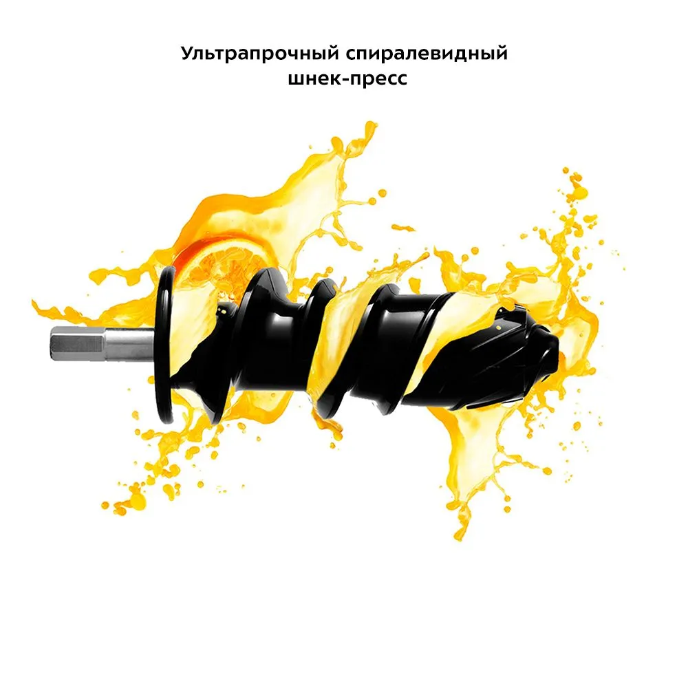Ультрапрочный спиралевидный шнек-пресс захватывает, дробит и прессует плоды, подающиеся к нему через загрузочный лоток в считанные секунды!