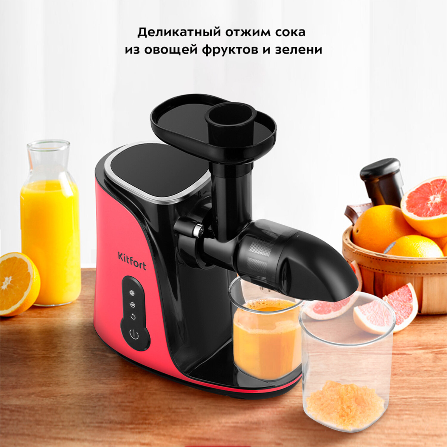 Соковыжималка Kitfort КТ-1141 с горизонтальным отжимом способствует деликатному извлечению максимального количества сока из фруктов, овощей и зелени при низких оборотах, при этом сохраняя все полезные компоненты: витамины, аминокислоты и минералы.