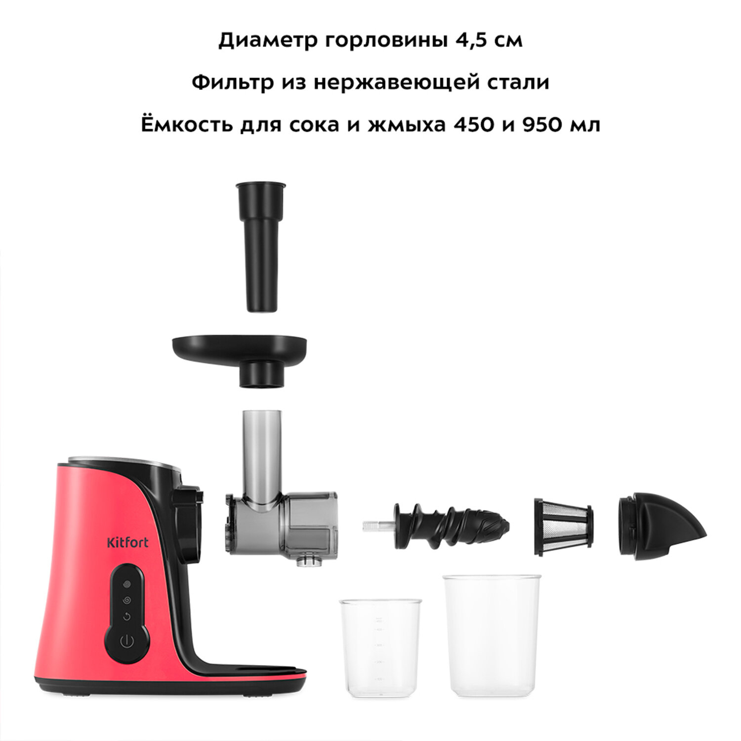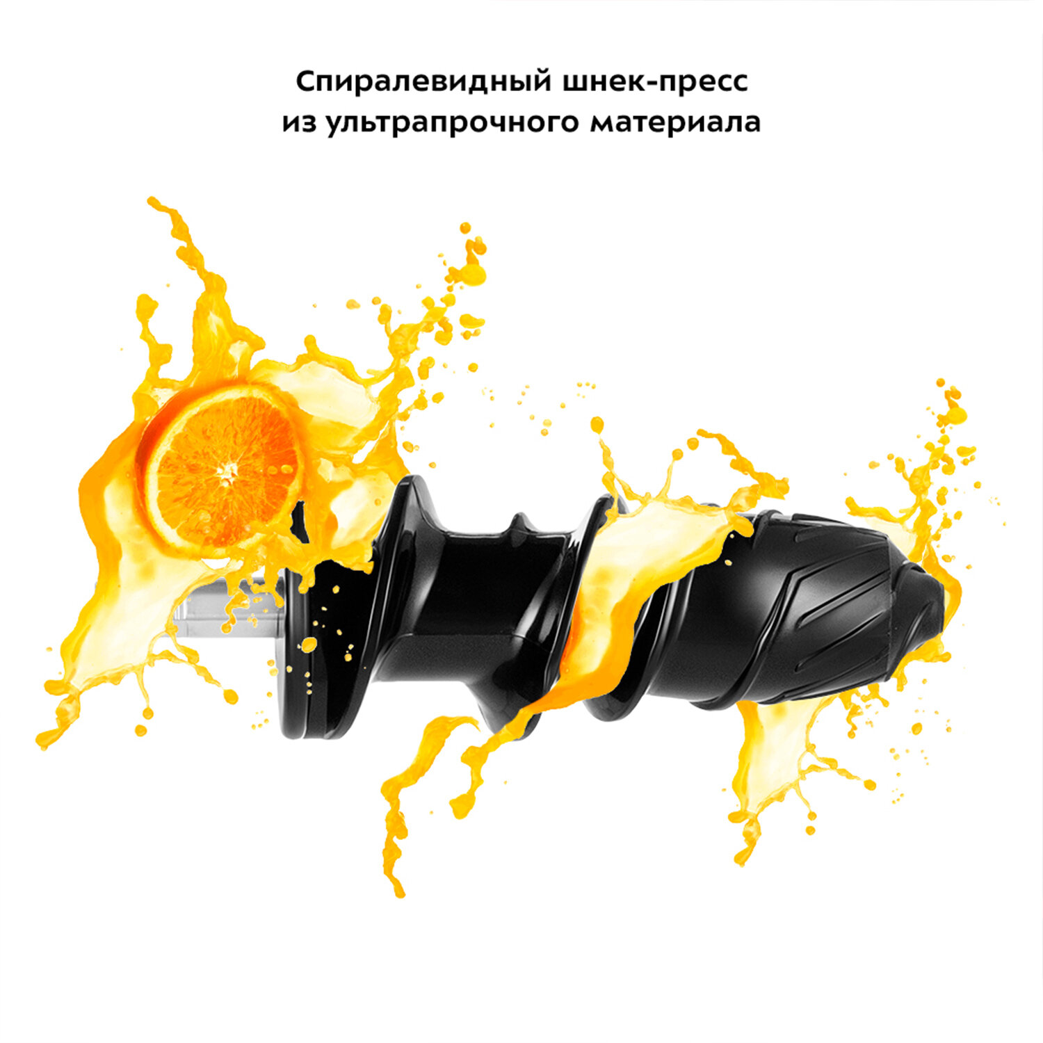 Принцип работы, как у мясорубки: шнек захватывает продукты, перемалывает, выдавливает сок и отделяет жмых. Шнек изготовлен из ультрапрочного пластика, который обладает высокой прочностью и способен выдерживать значительные нагрузки.