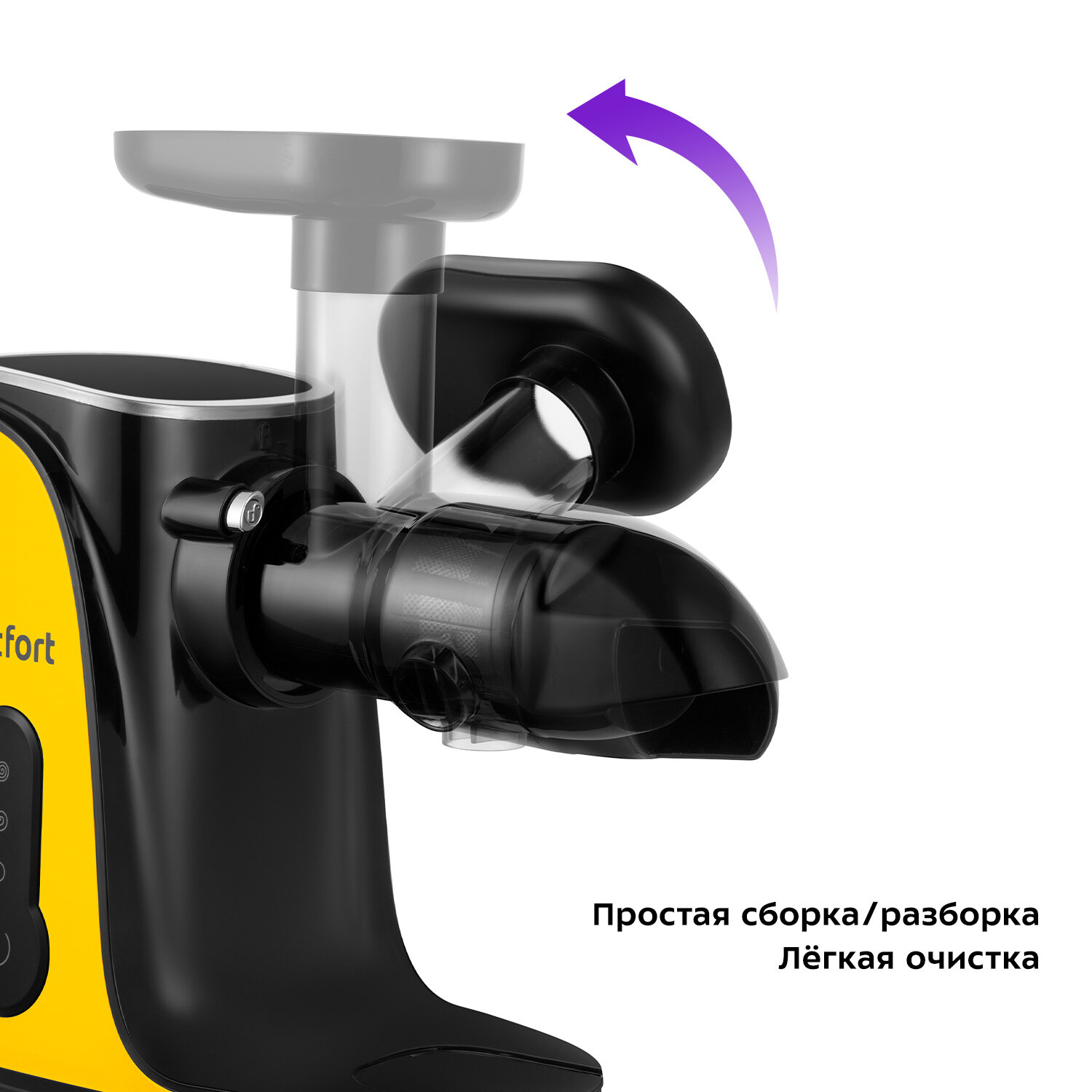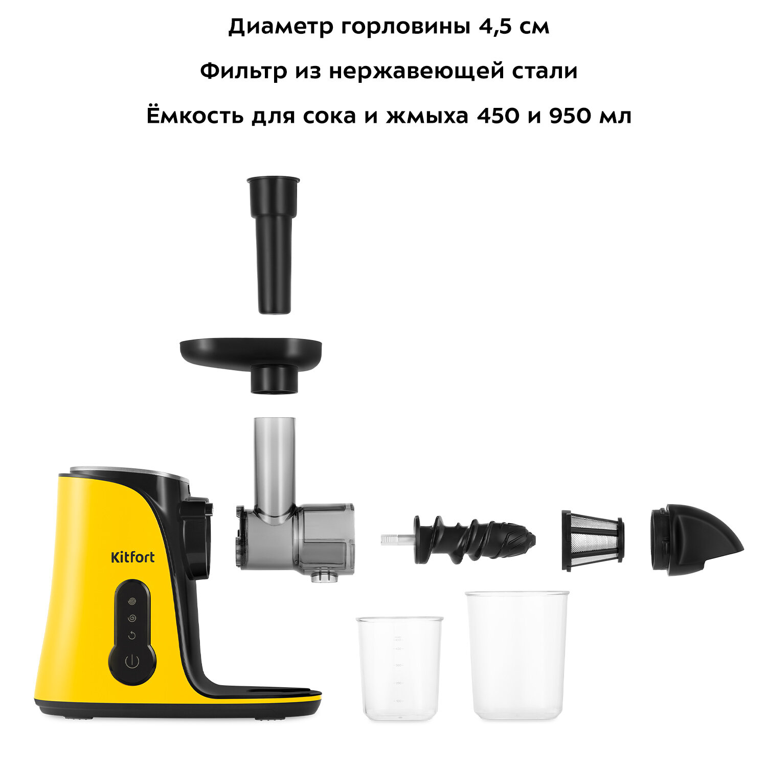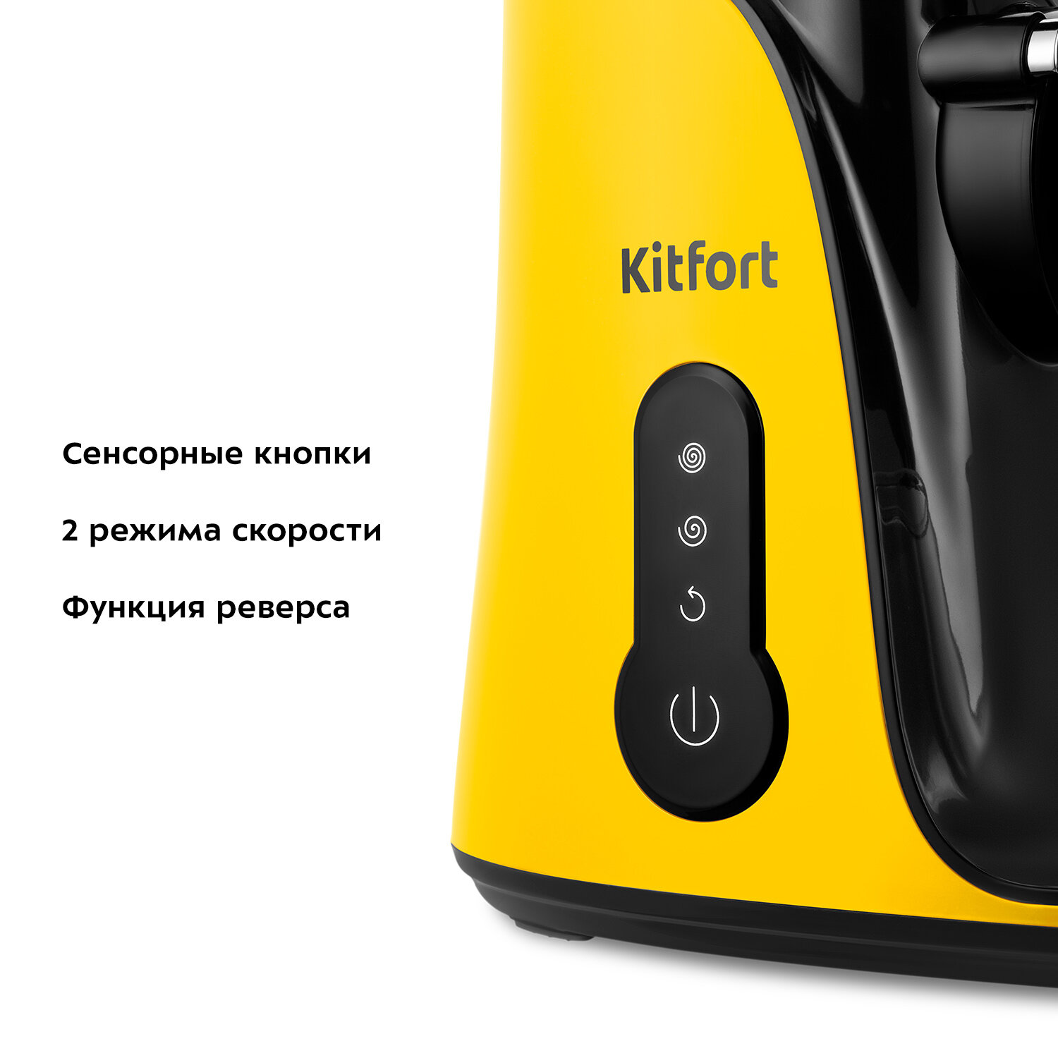 Соковыжималка Kitfort КТ-1141 с горизонтальным отжимом способствует деликатному извлечению максимального количества сока из фруктов, овощей и зелени при низких оборотах, при этом сохраняя все полезные компоненты: витамины, аминокислоты и минералы. На боковой панели соковыжималки размещена сенсорная панель для включения/выключения, регулировки скорости, а также для включения реверса. Последняя функция упрощает процесс очистки шнека после отжима и облегчает извлечение остатков. Принцип работы, как у мясорубки: шнек захватывает продукты, перемалывает, выдавливает сок и отделяет жмых. Шнек изготовлен из ультрапрочного пластика, который обладает высокой прочностью и способен выдерживать значительные нагрузки. Все части соковыжималки собираются интуитивно понятно, быстро и легко. Сборка должна занимать не более одной минуты. В случае неправильной сборки соковыжималка не включится. Все съёмные детали легко очищаются. Корпус соковыжималки выполнен из пластика с металлическими вставками. Толкатель обладает особой конструкцией, которая предотвращает его контакт с движущимися частями. Сетка фильтра выполнена из нержавеющей стали. В комплекте имеется удобная щёточка для удаления остатков мякоти из сетки фильтра. Если крышку для выхода сока и жмыха будет трудно открутить после использования, в комплекте есть специальный ключ.